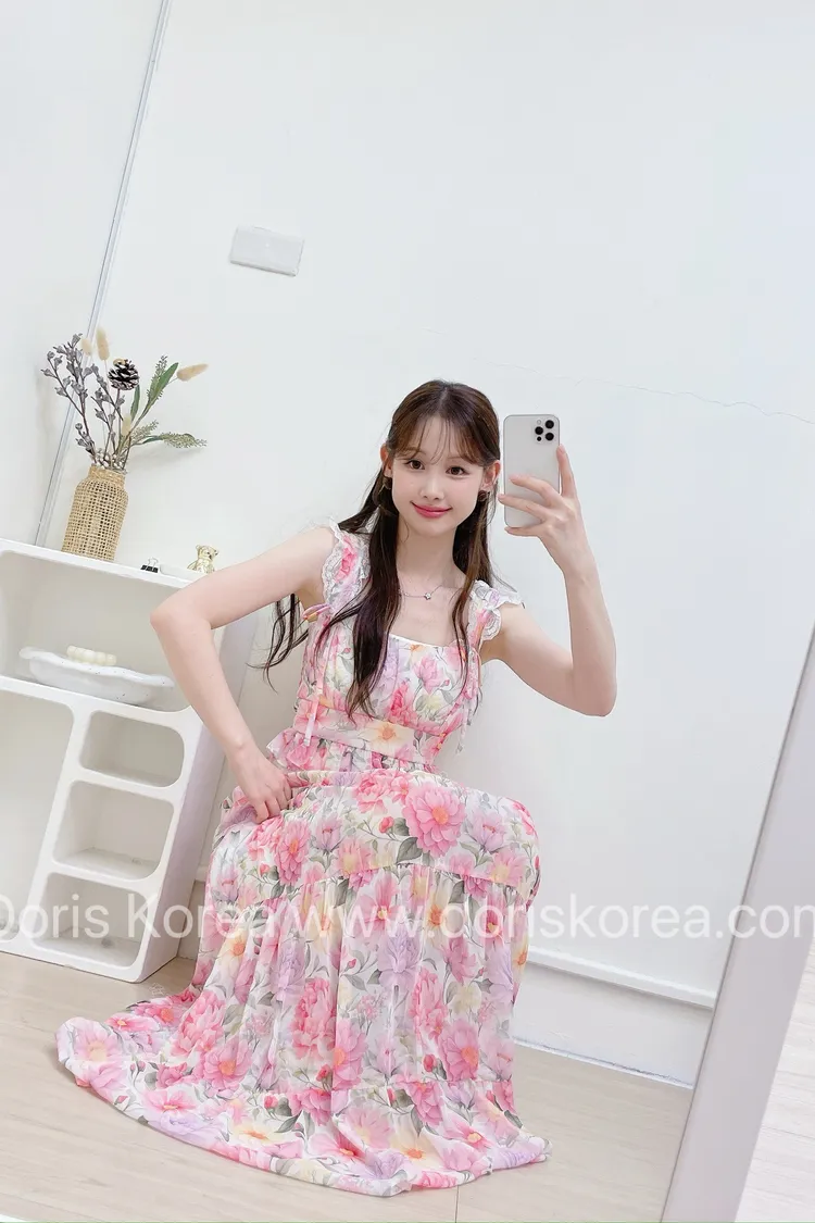 肩膀蕾絲拼接中荷葉腰花卉洋裝(粉紫)