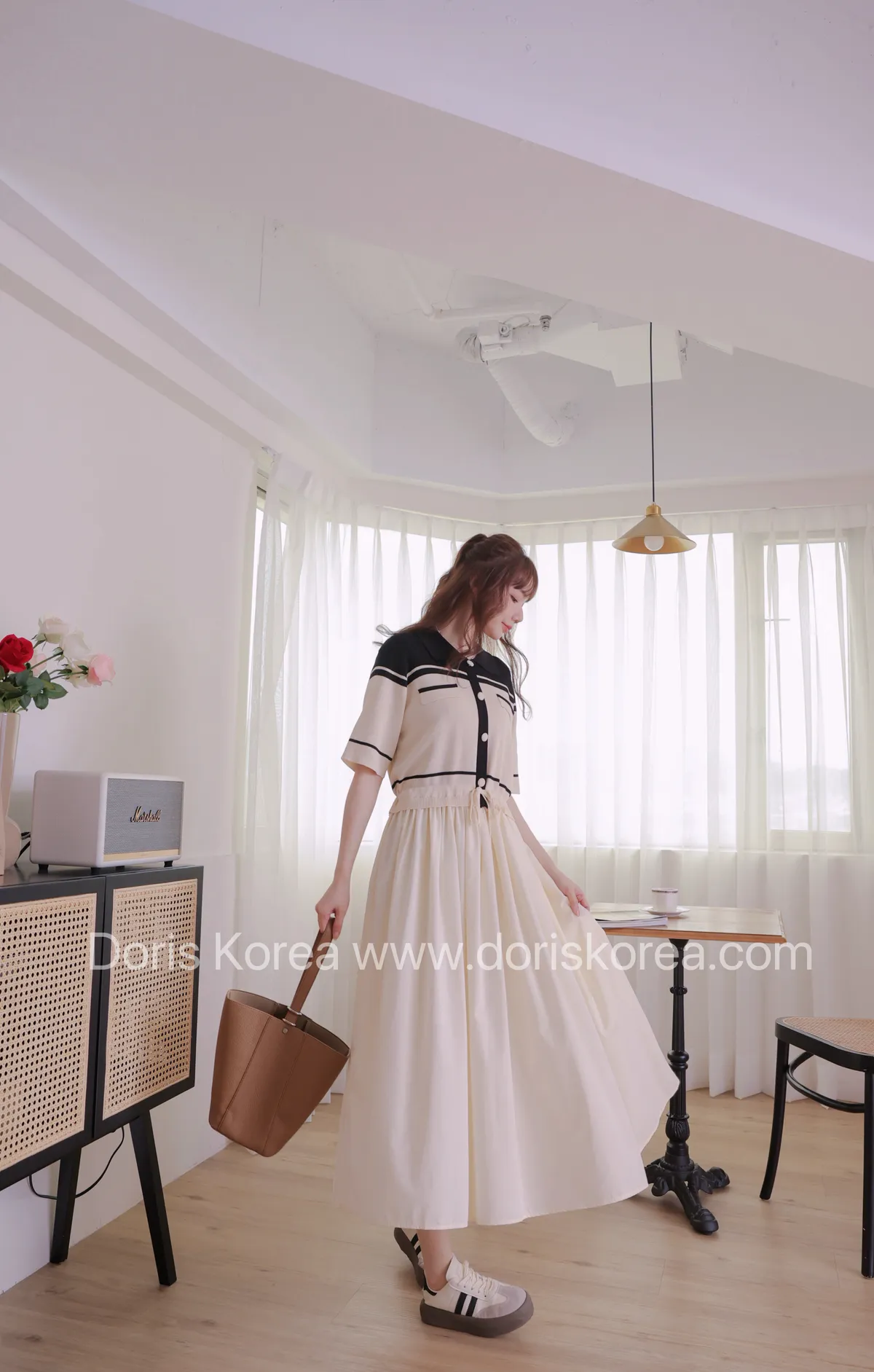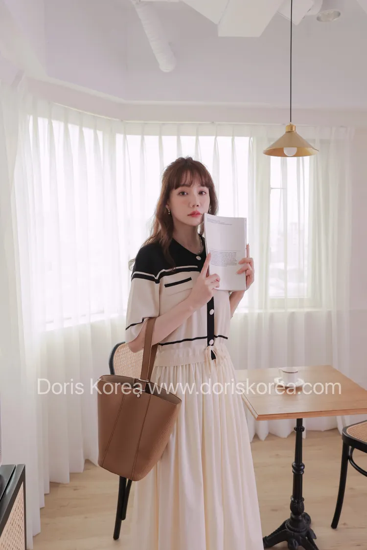 配色POLO領下接素色洋裝(杏)