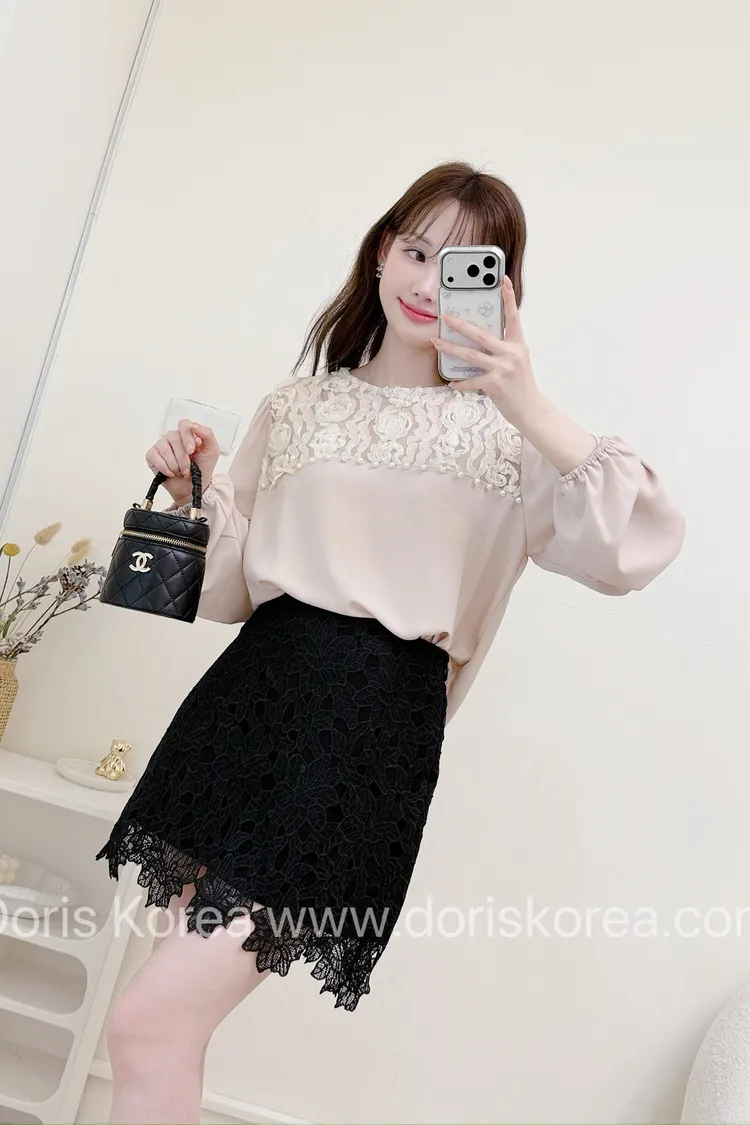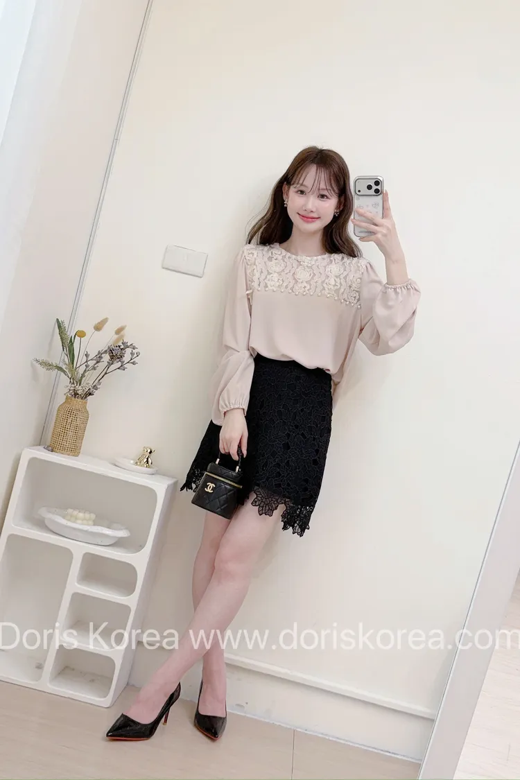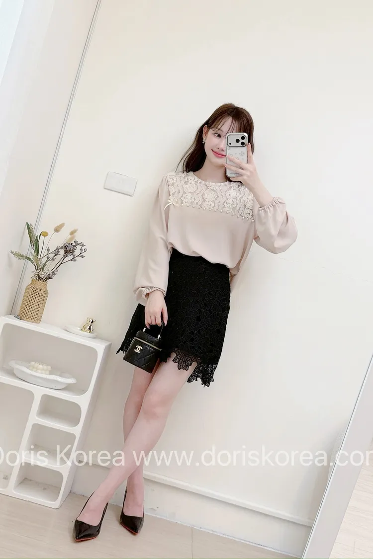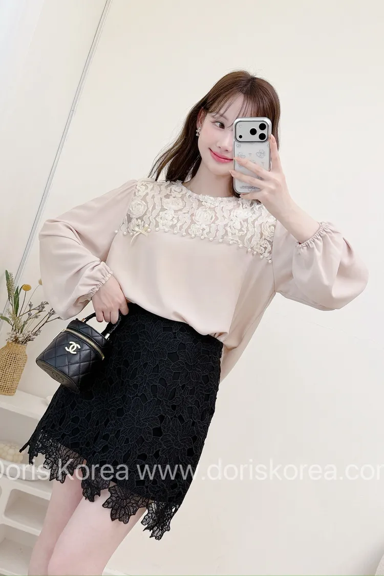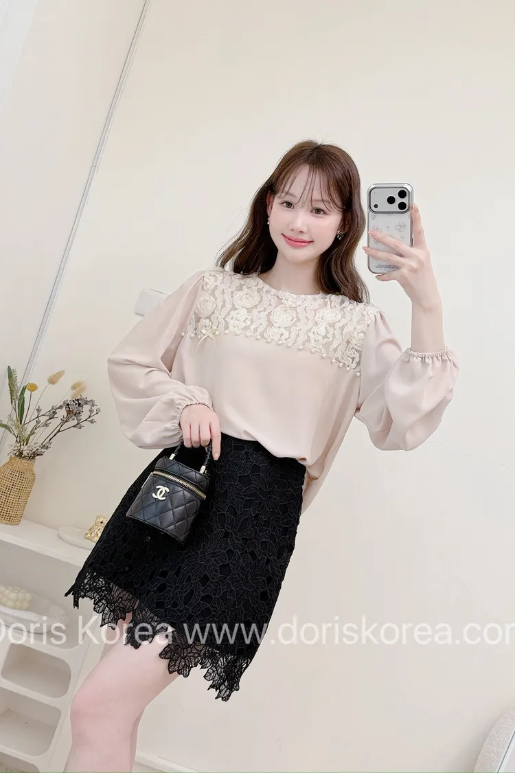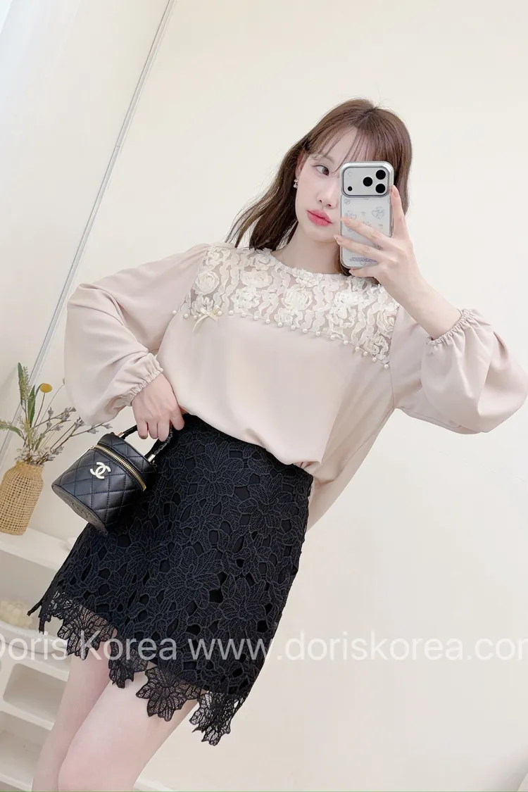 玫瑰網紗蝴蝶結雪紡衫(杏)