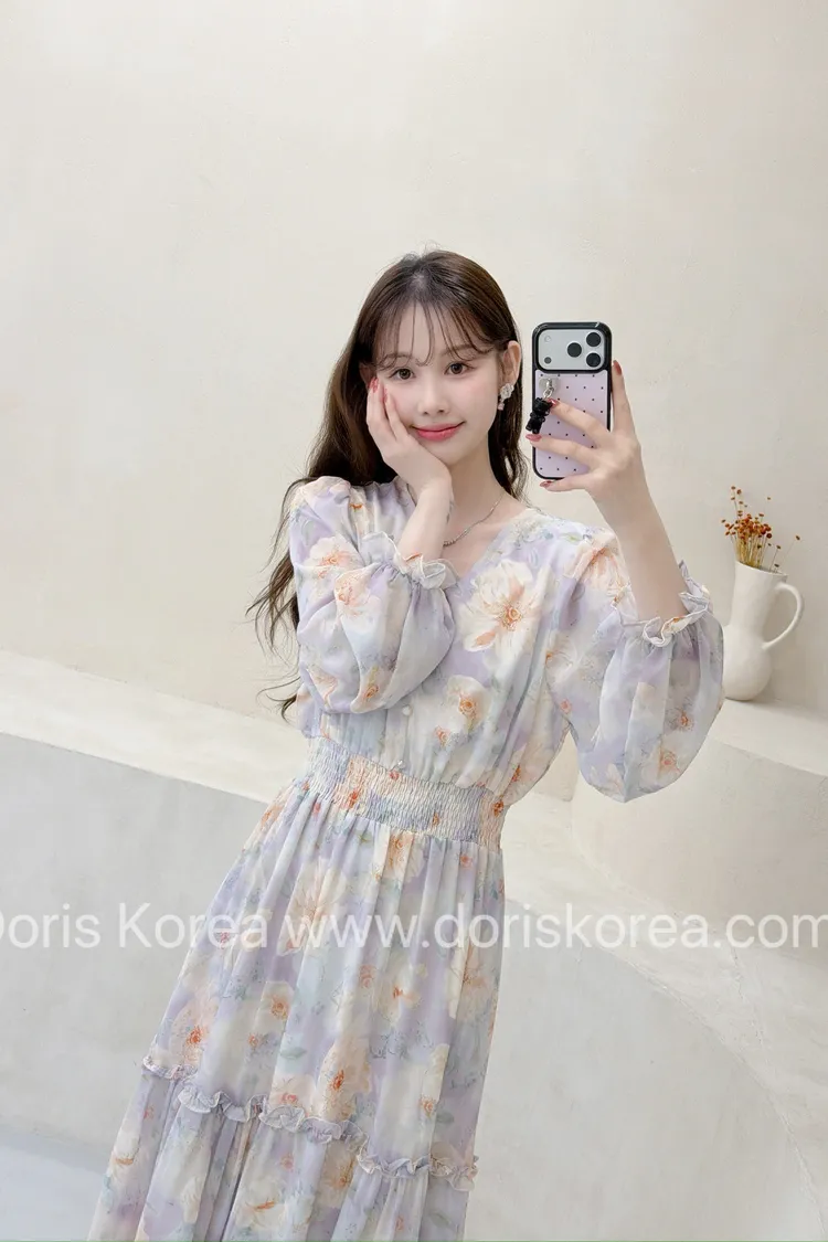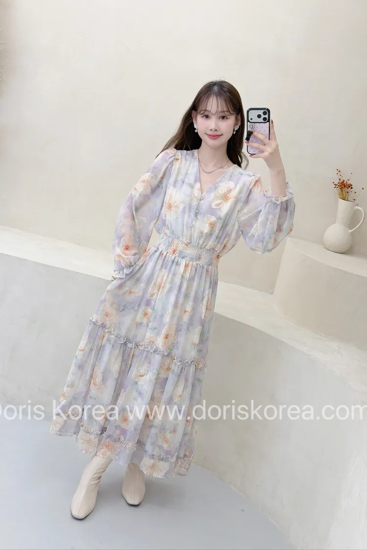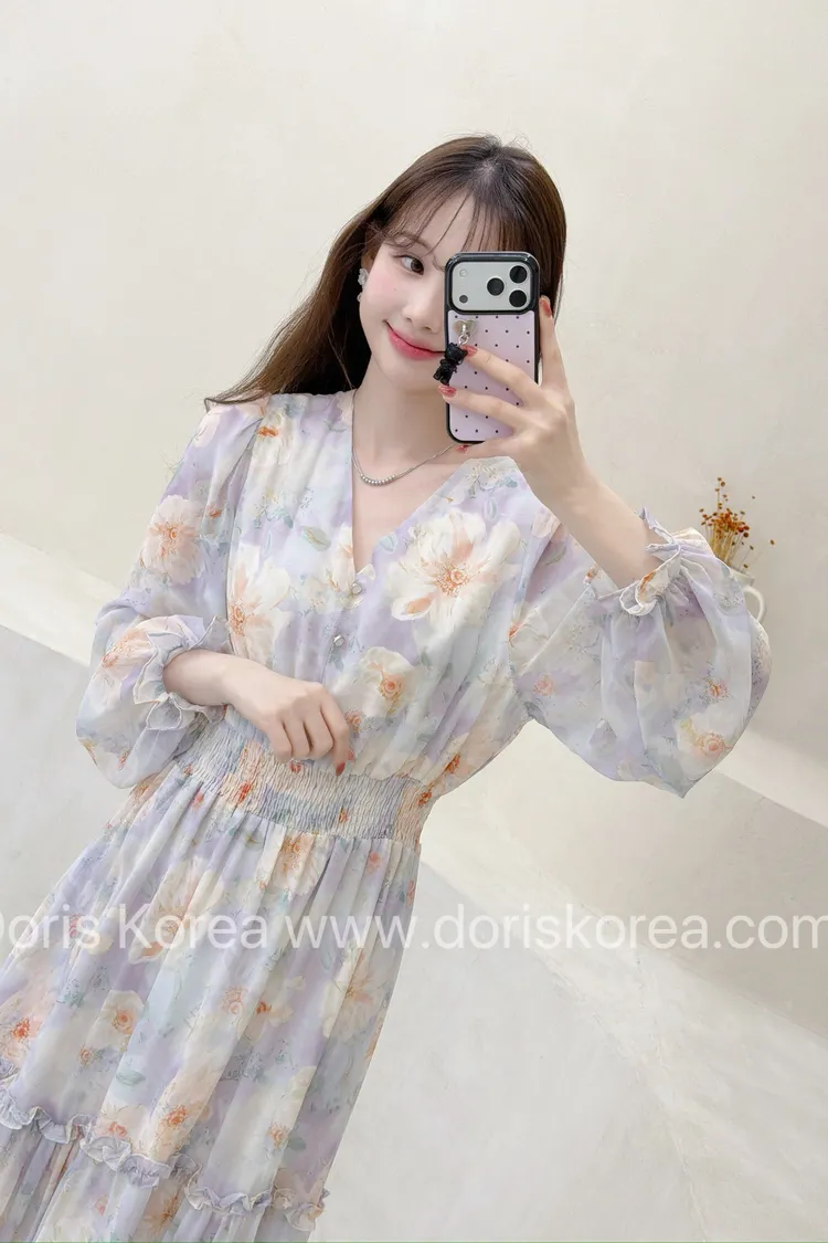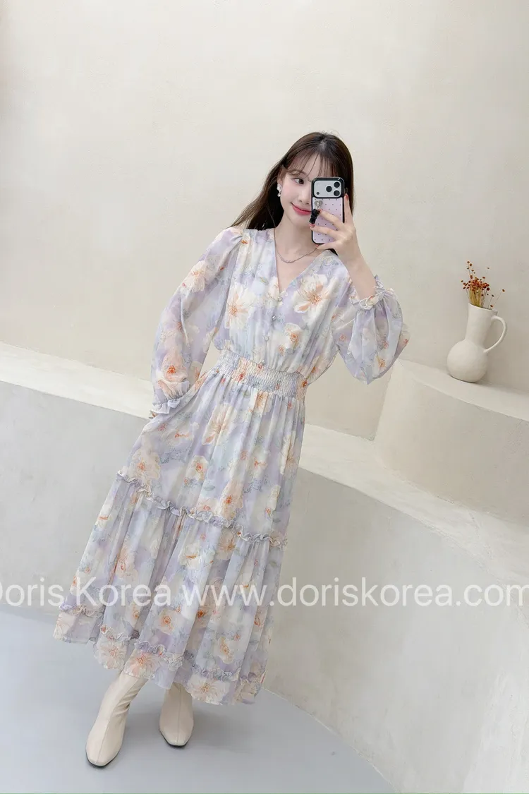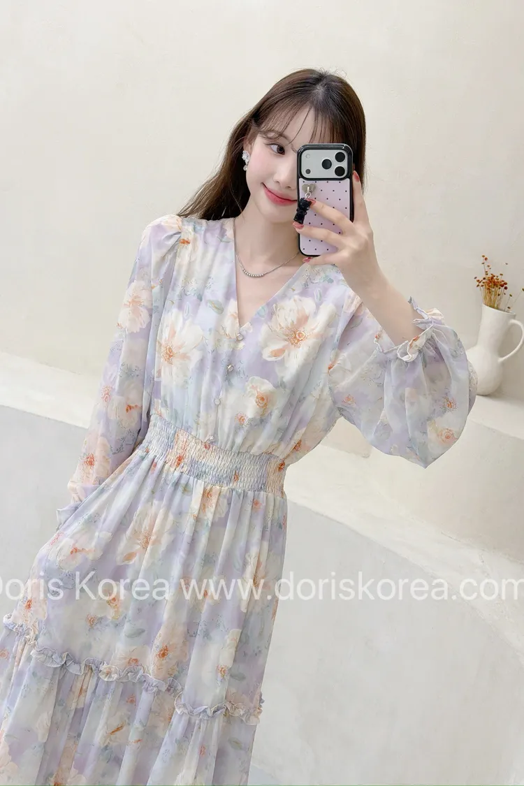 V字淺紫色花卉洋裝