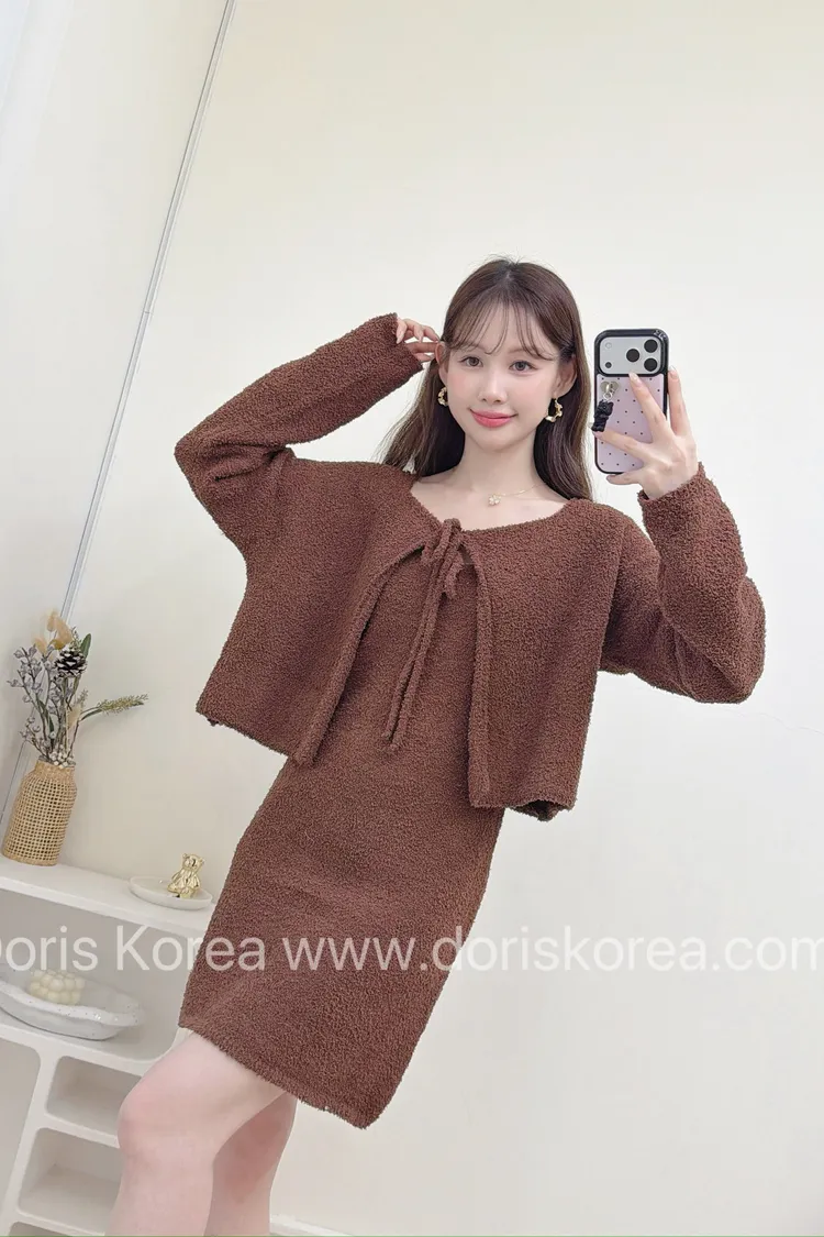 熊熊細肩帶短洋裝+外套(咖)