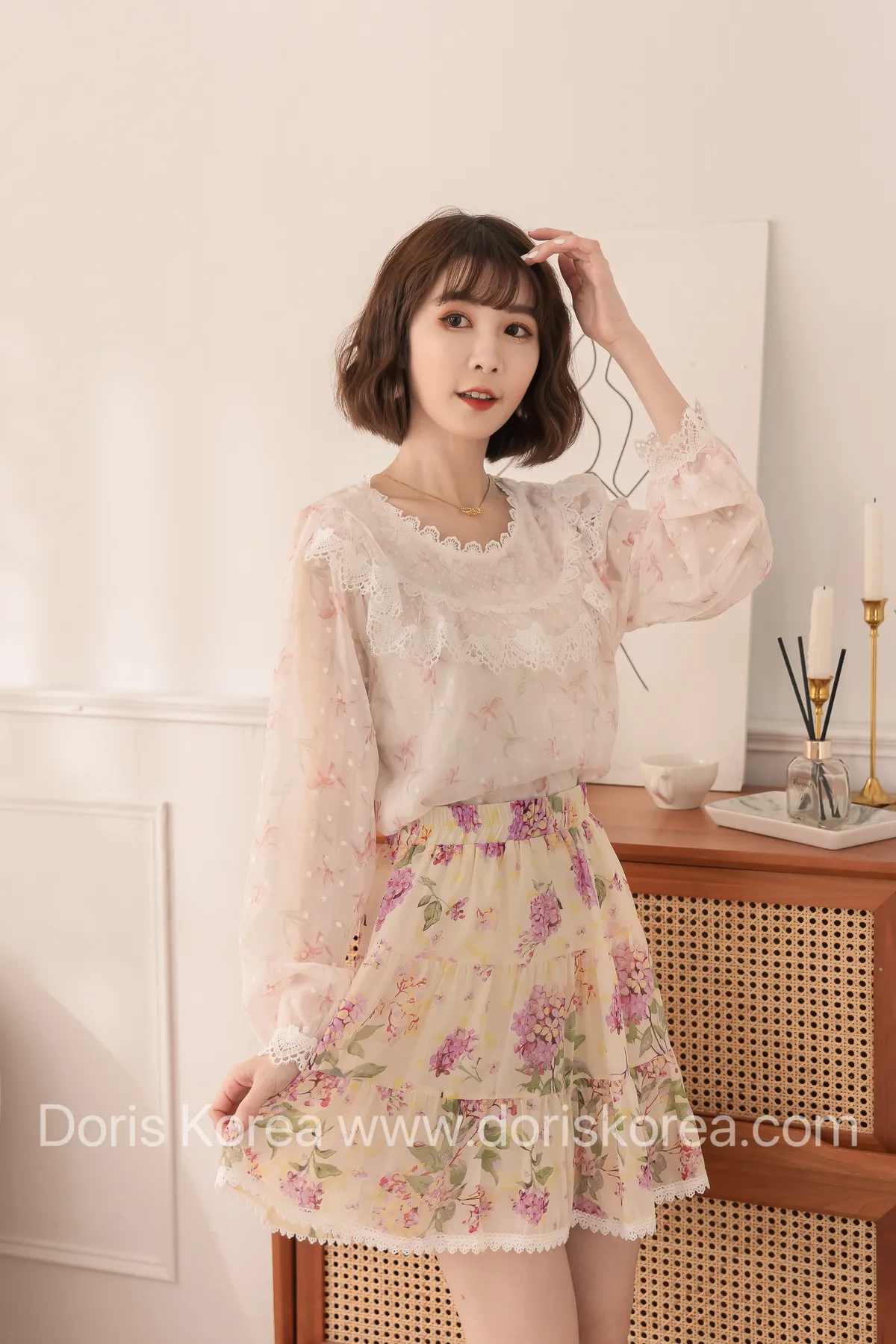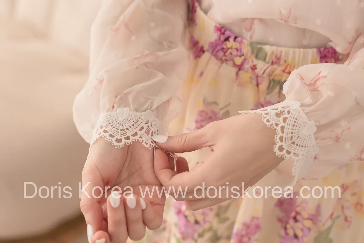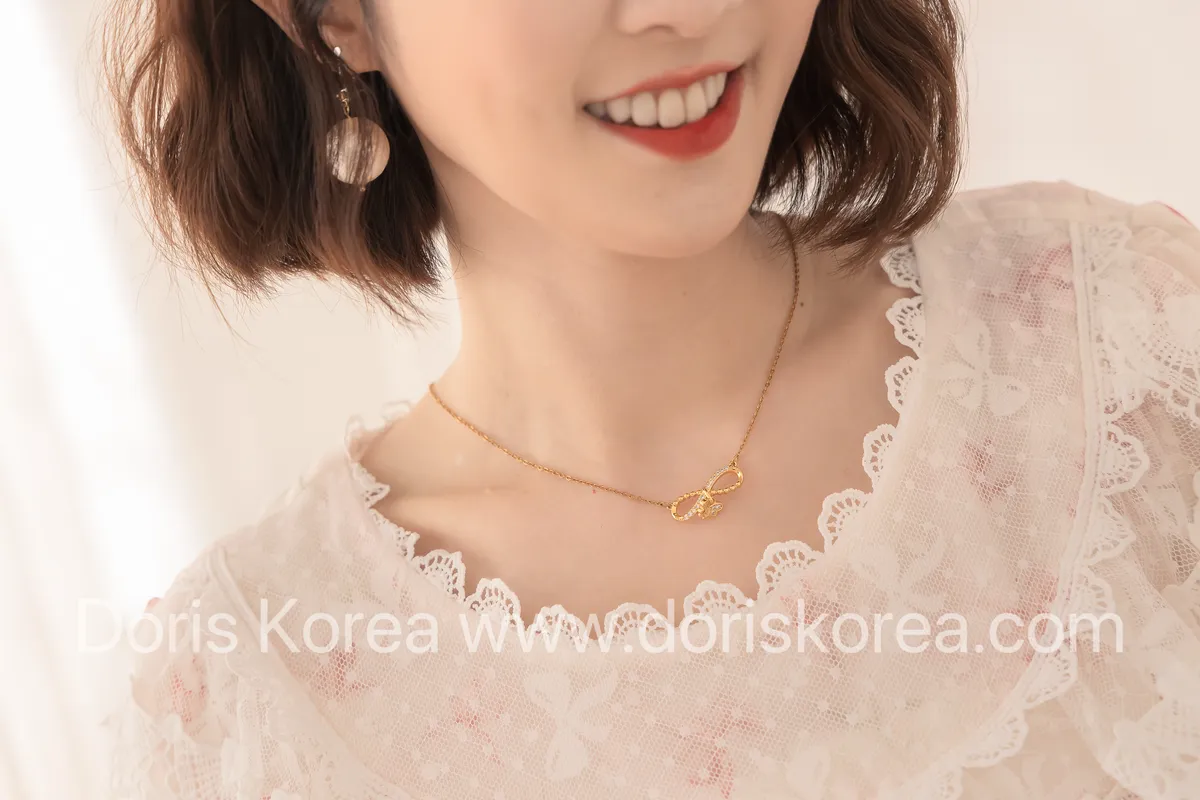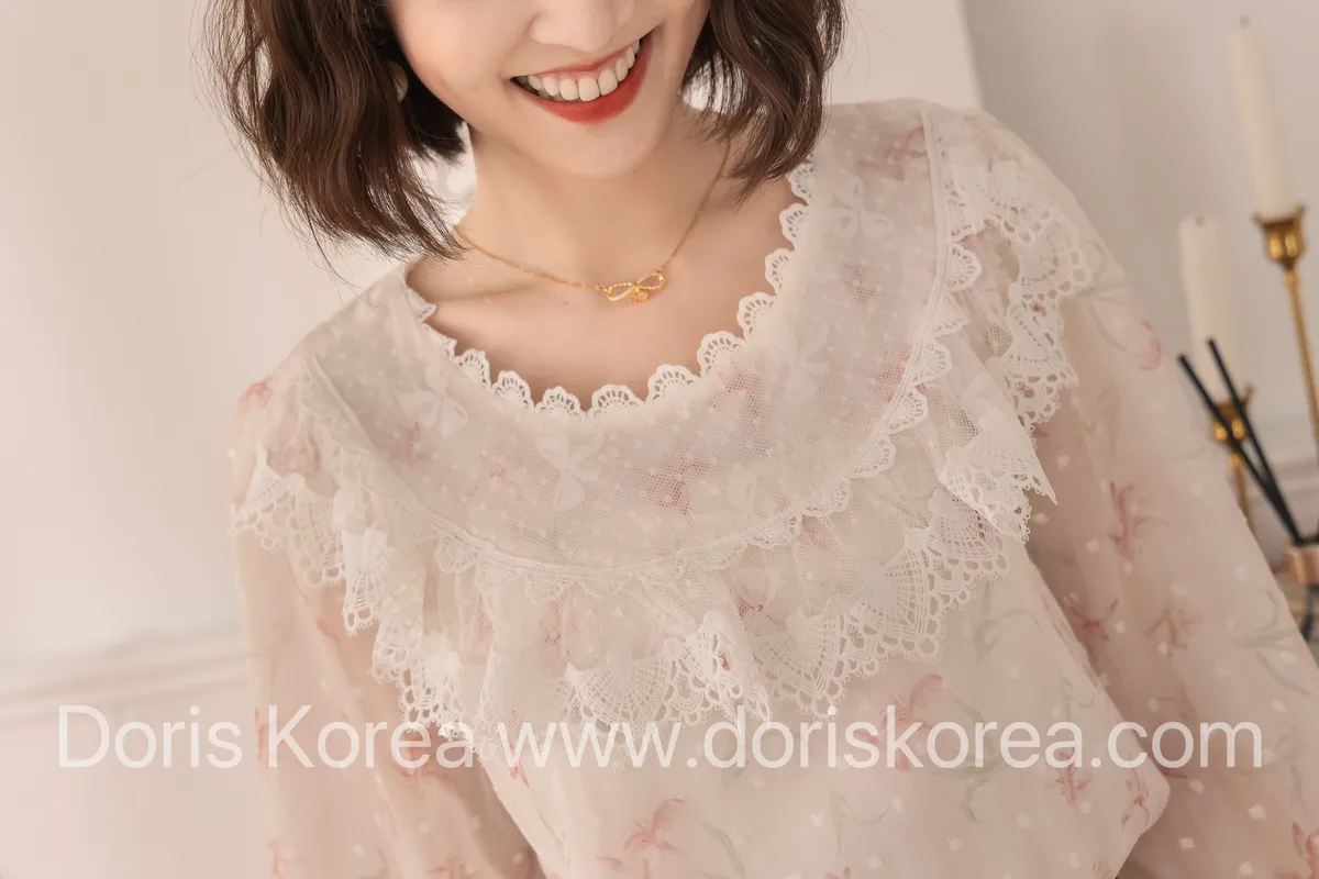 蕾絲蝴蝶結圓領澎袖衫(杏)