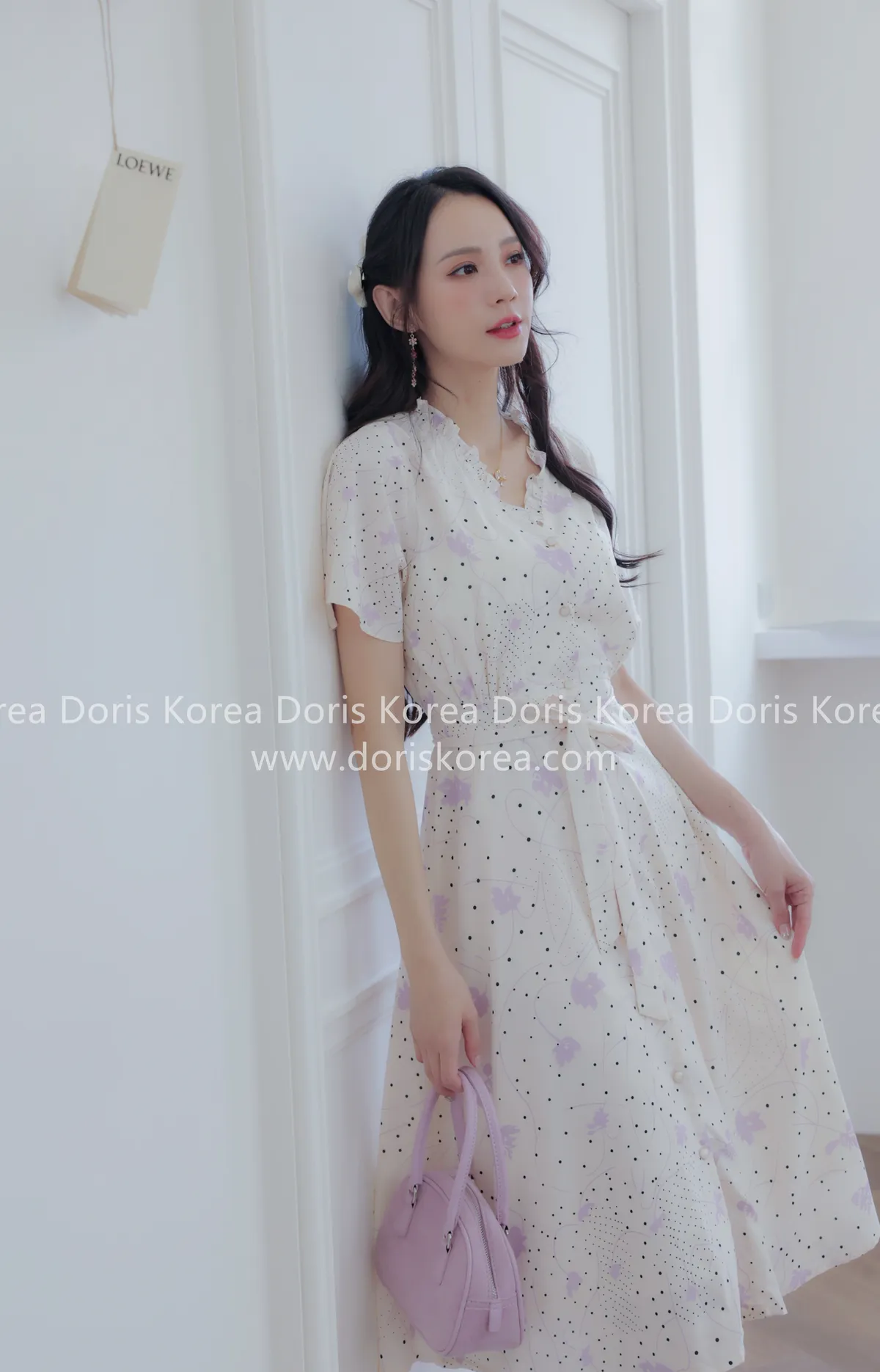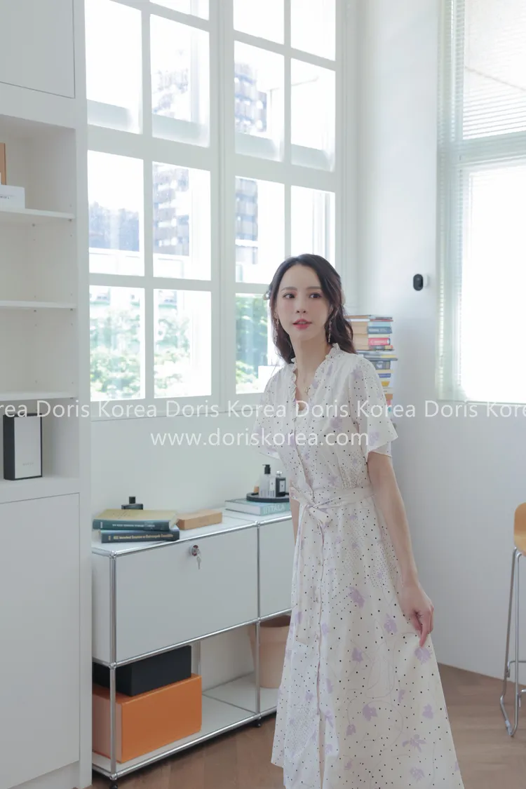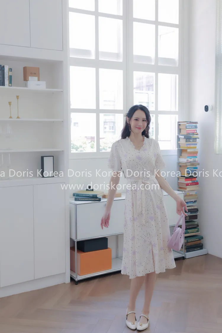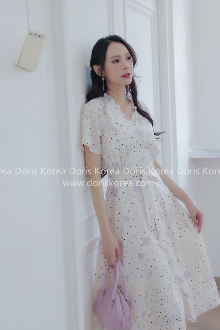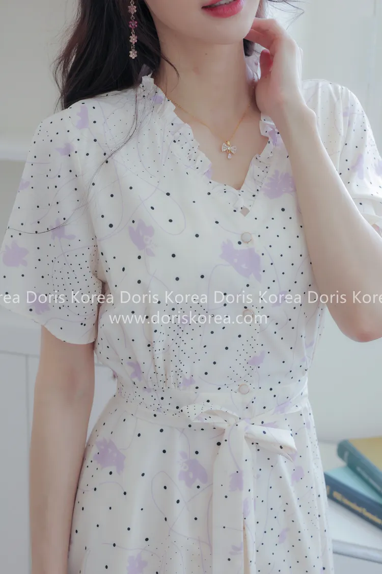 自訂款-手繪感紫葉片V字排扣洋裝(奶白)