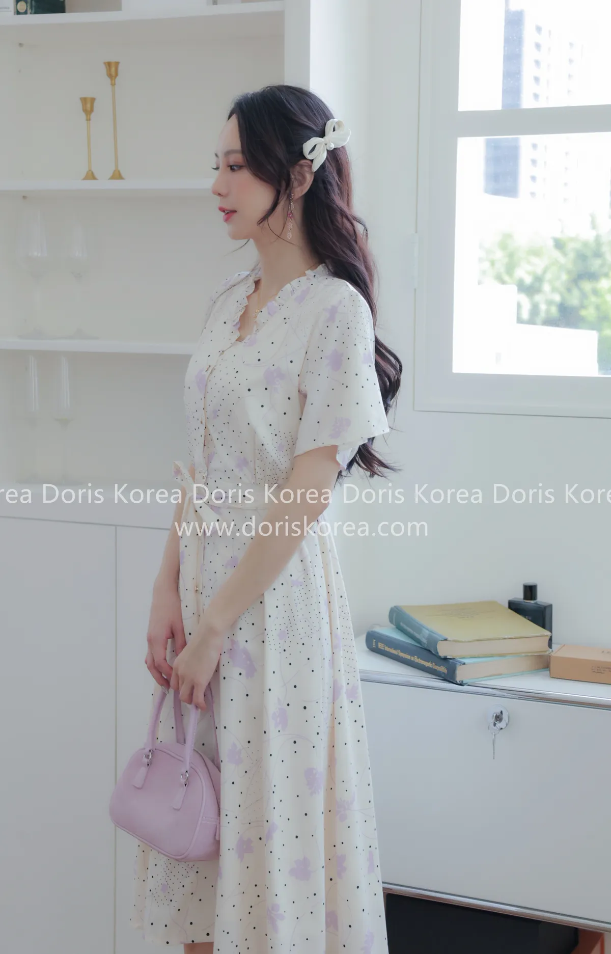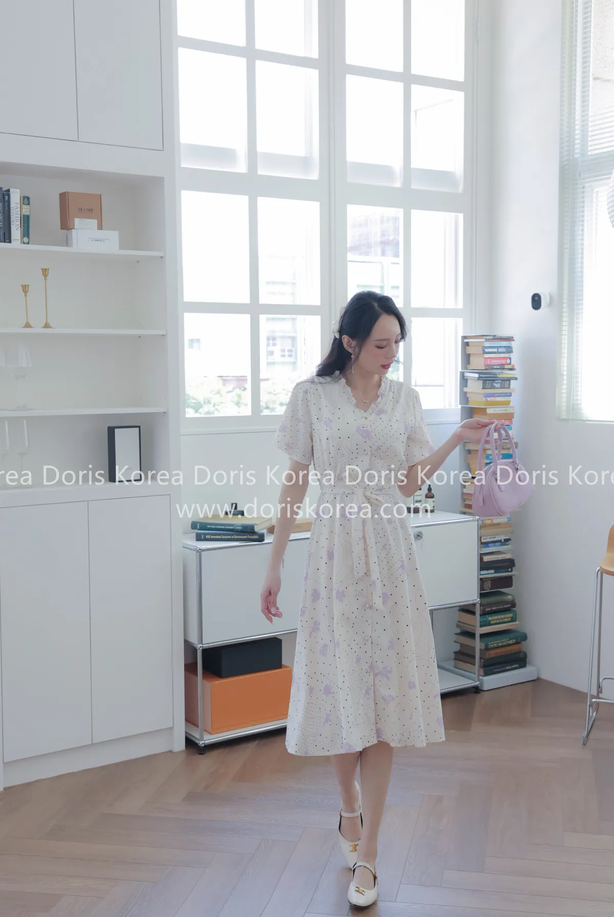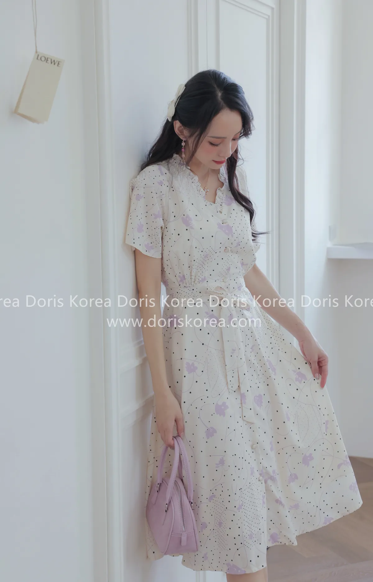 自訂款-手繪感紫葉片V字排扣洋裝(奶白)