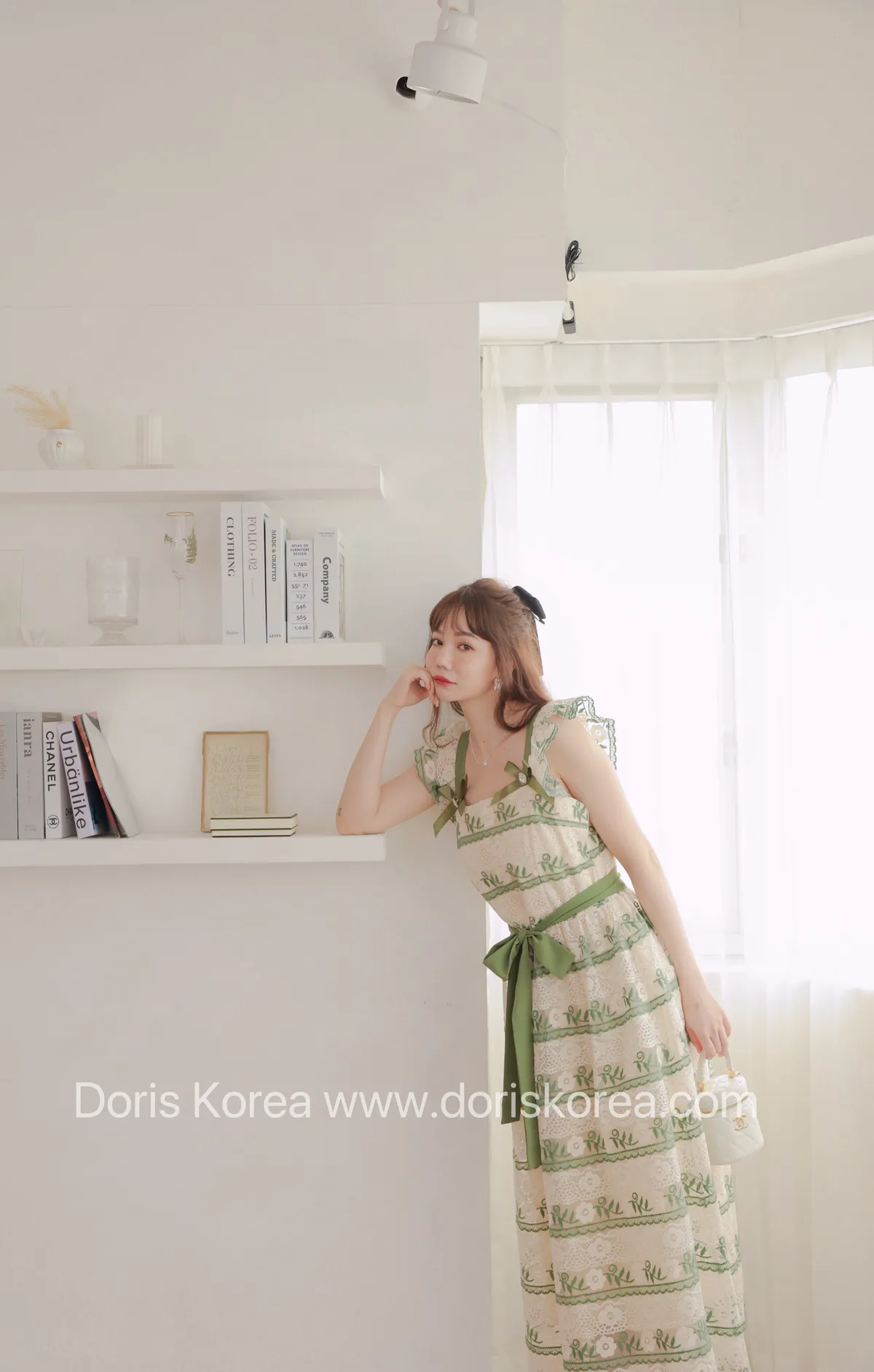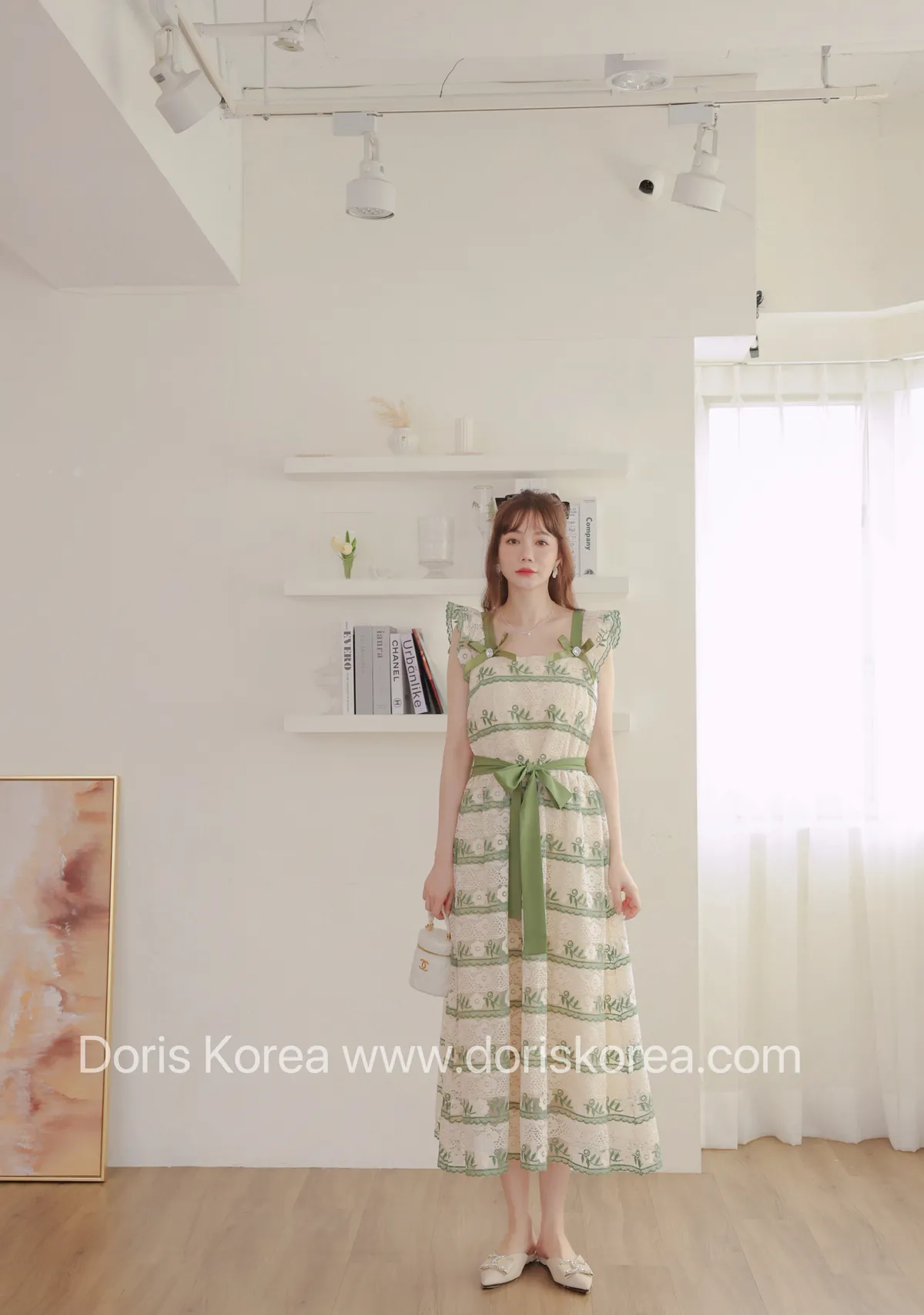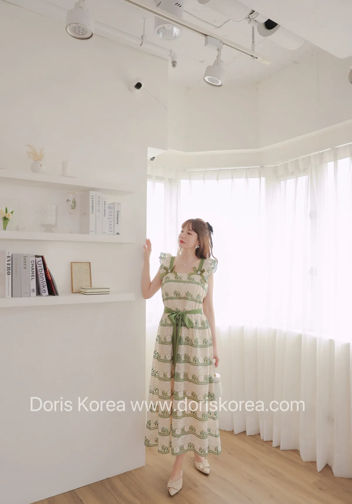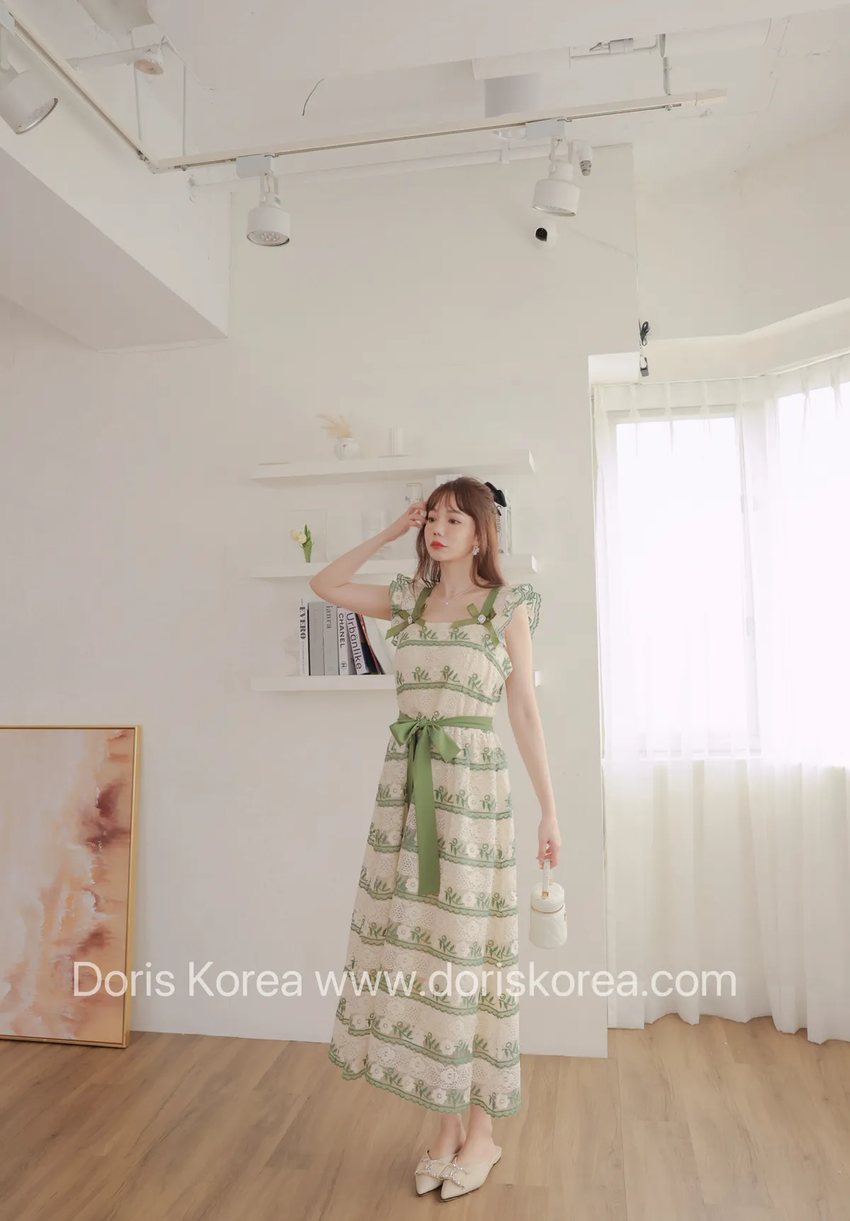 自訂款-多層蕾絲拼色蝴蝶結方領洋裝(綠)