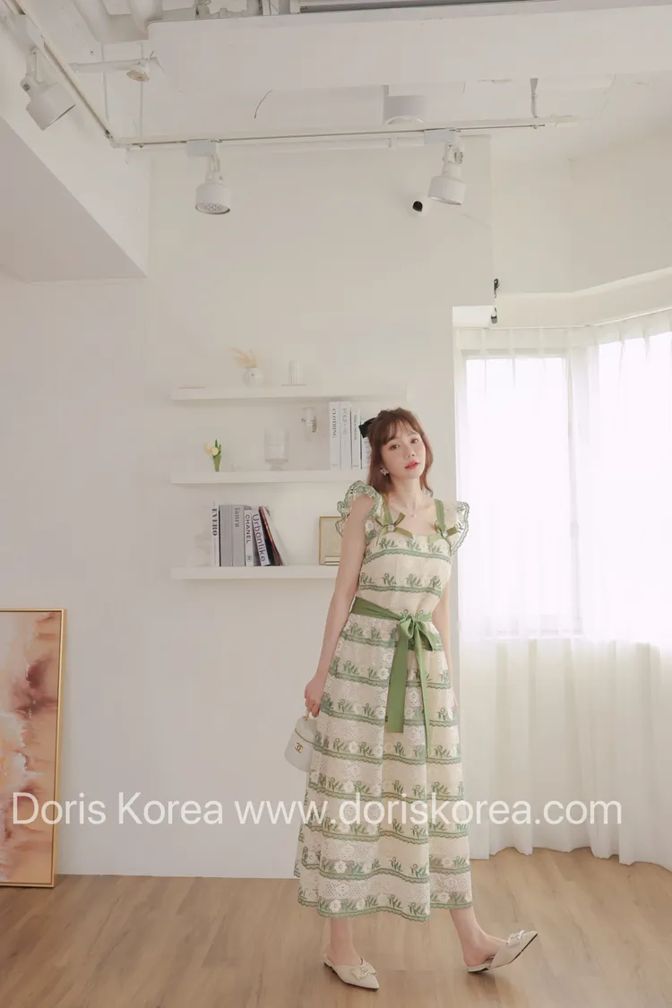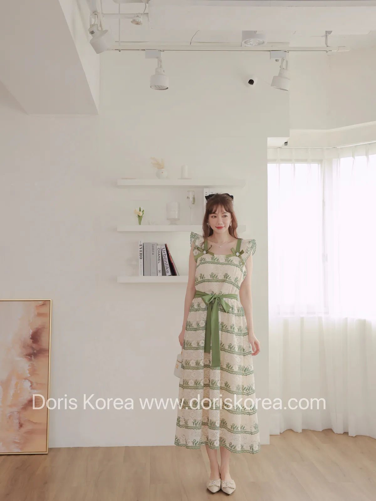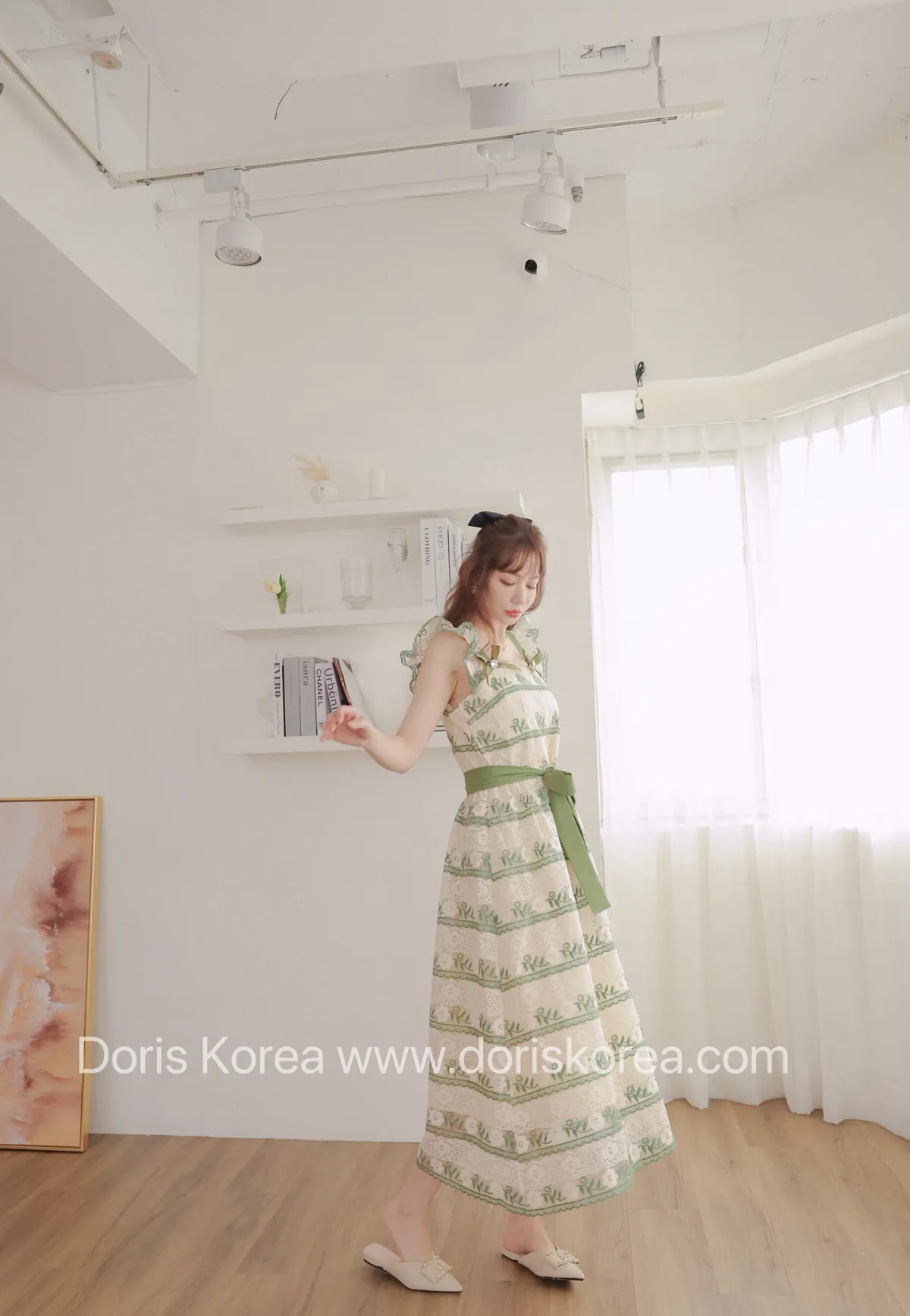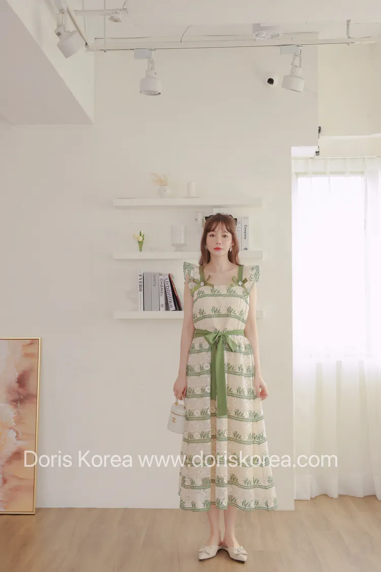 自訂款-多層蕾絲拼色蝴蝶結方領洋裝(綠)