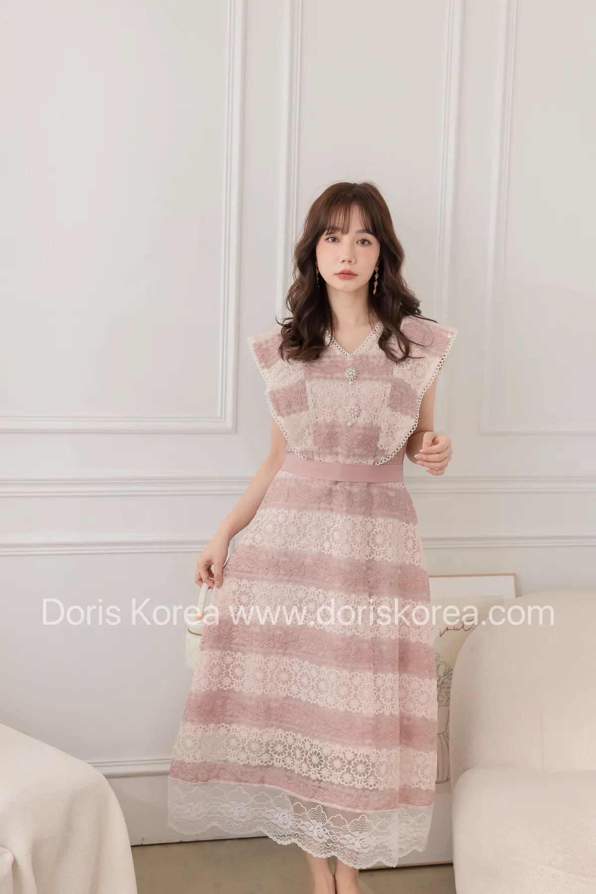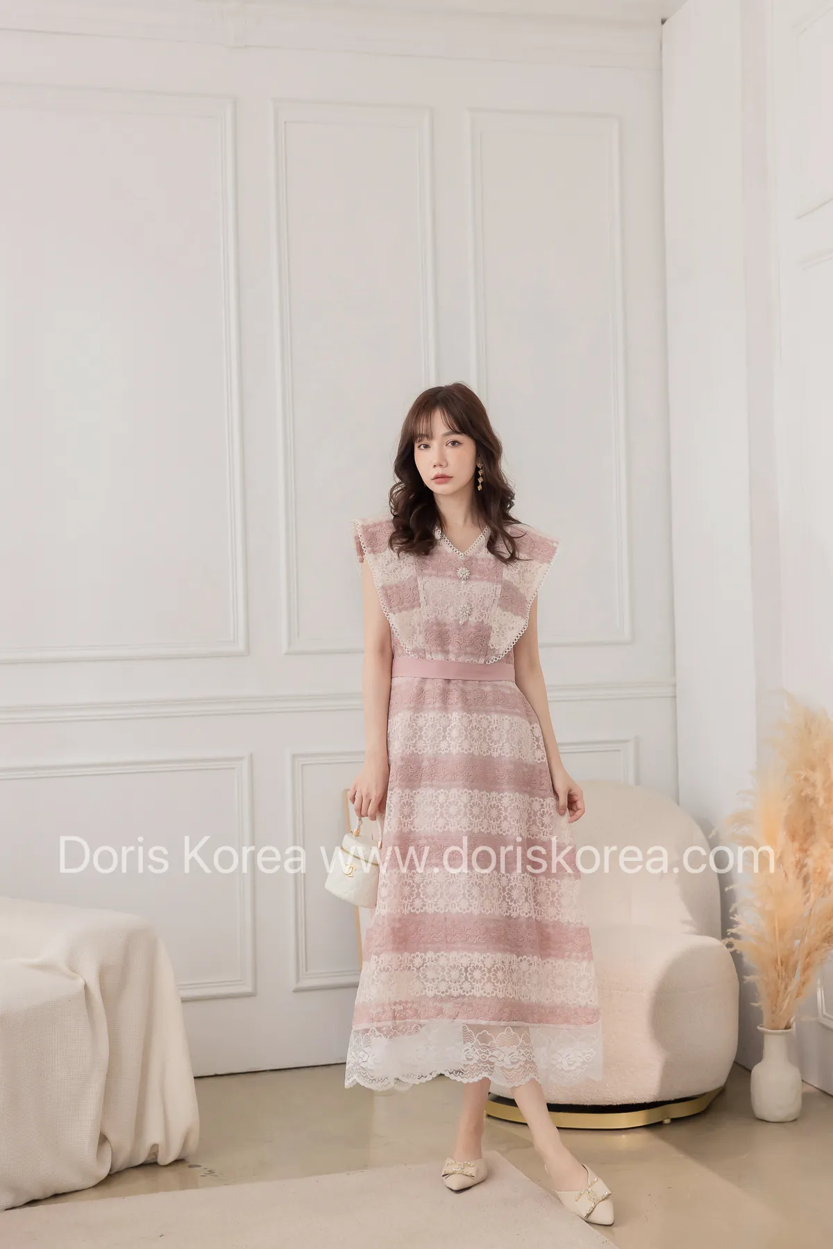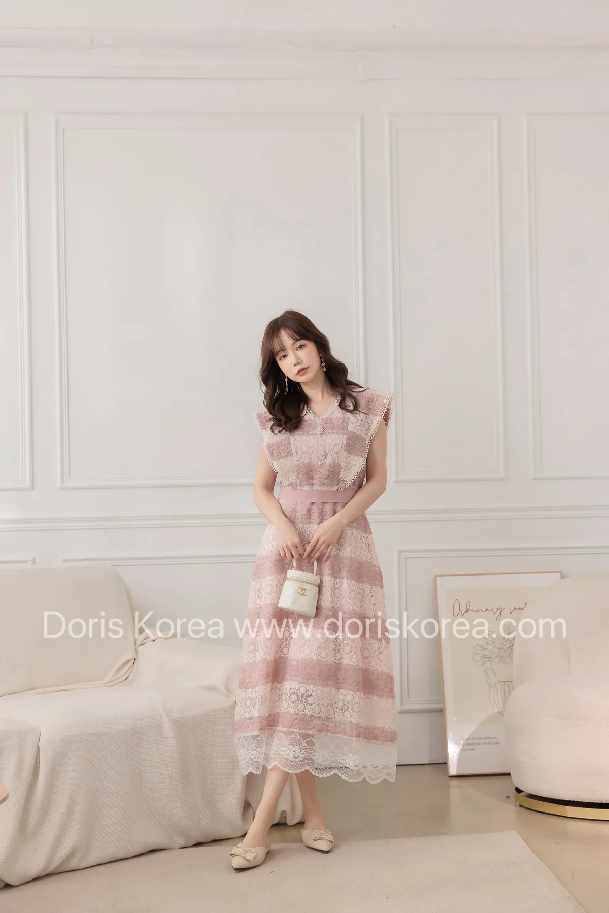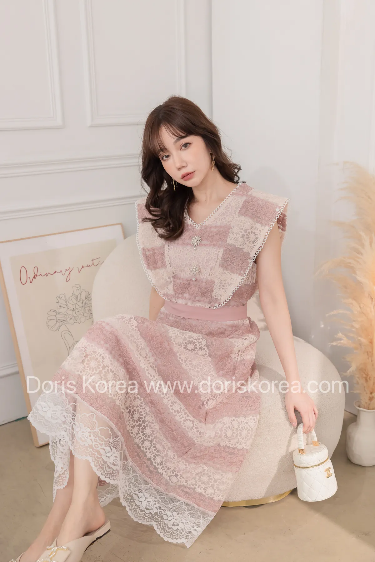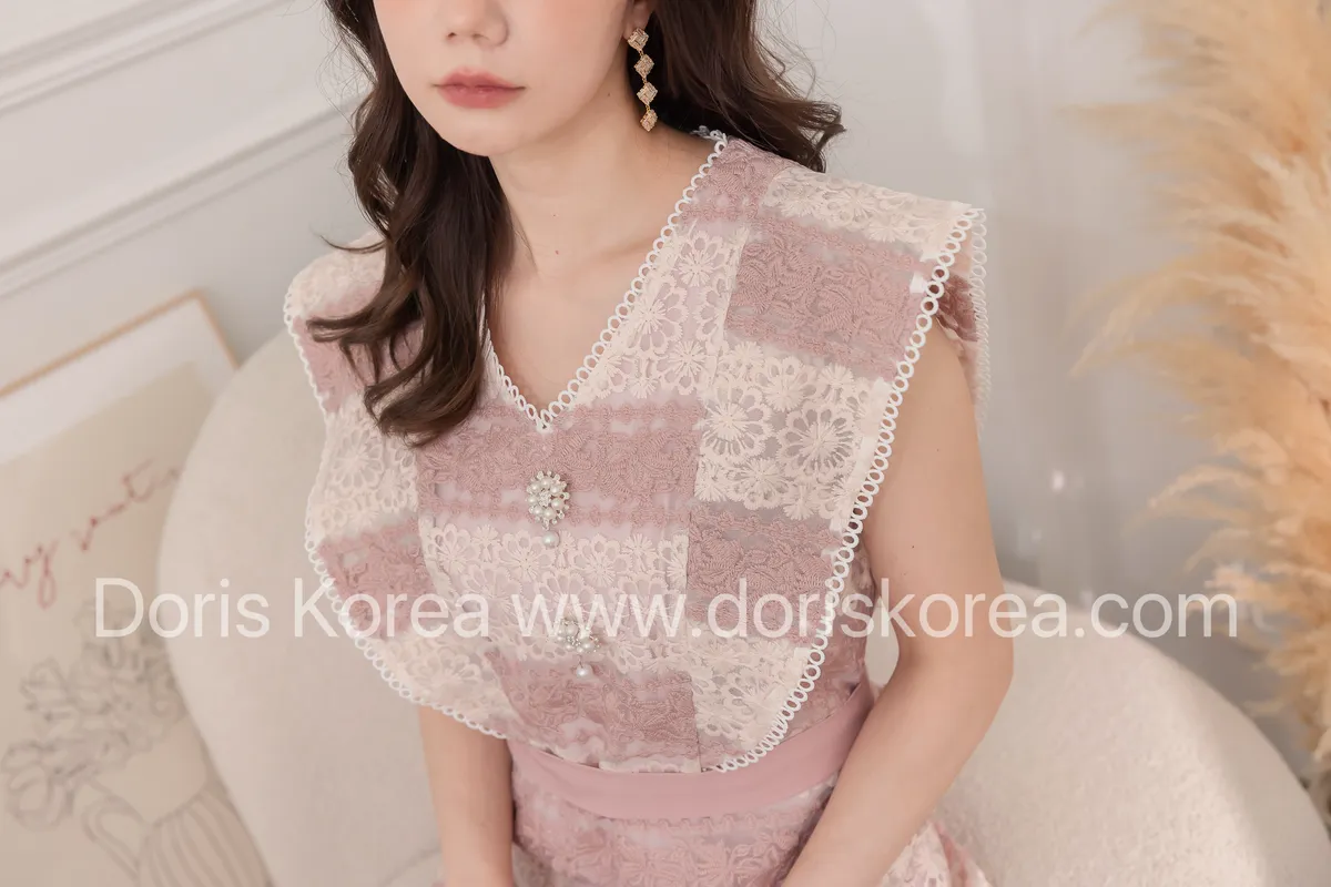 自訂款-雙色蕾絲鑽釦洋裝(粉)(附腰帶)