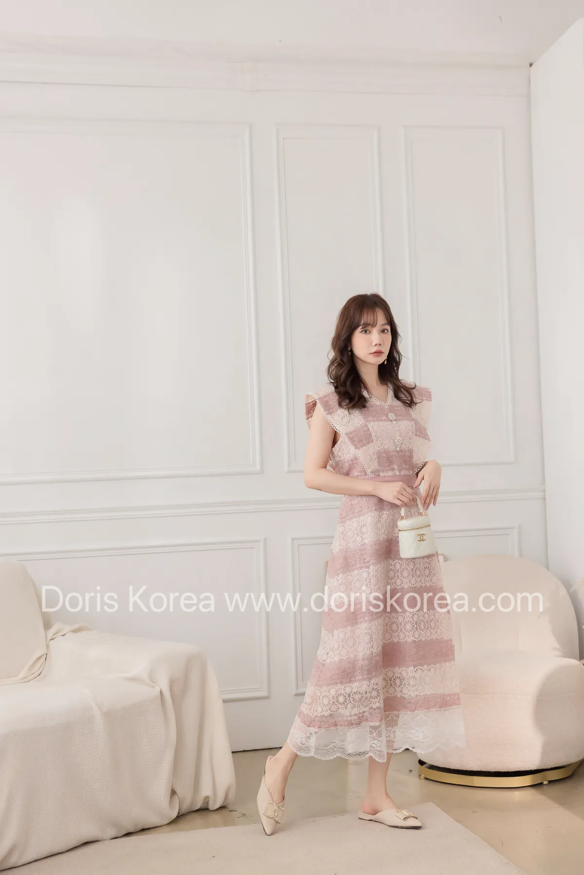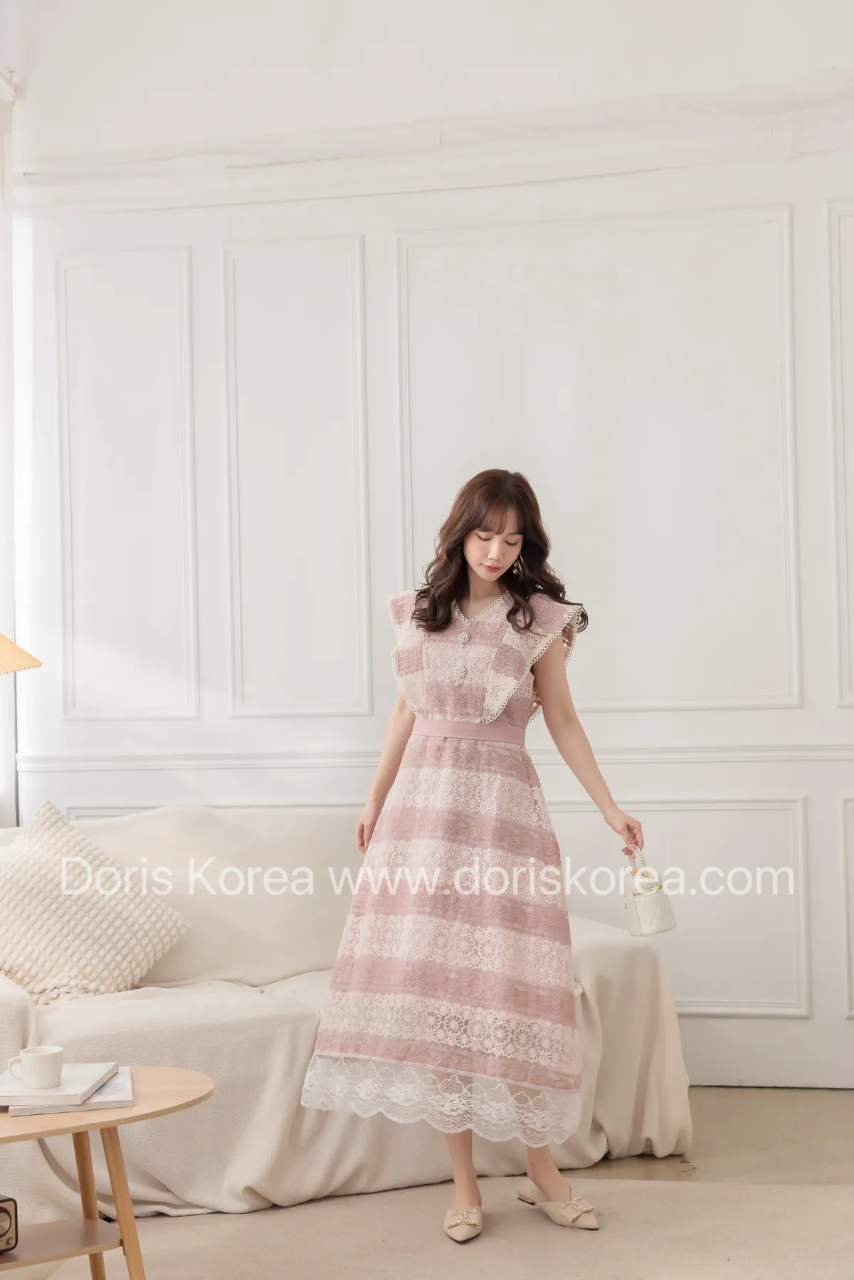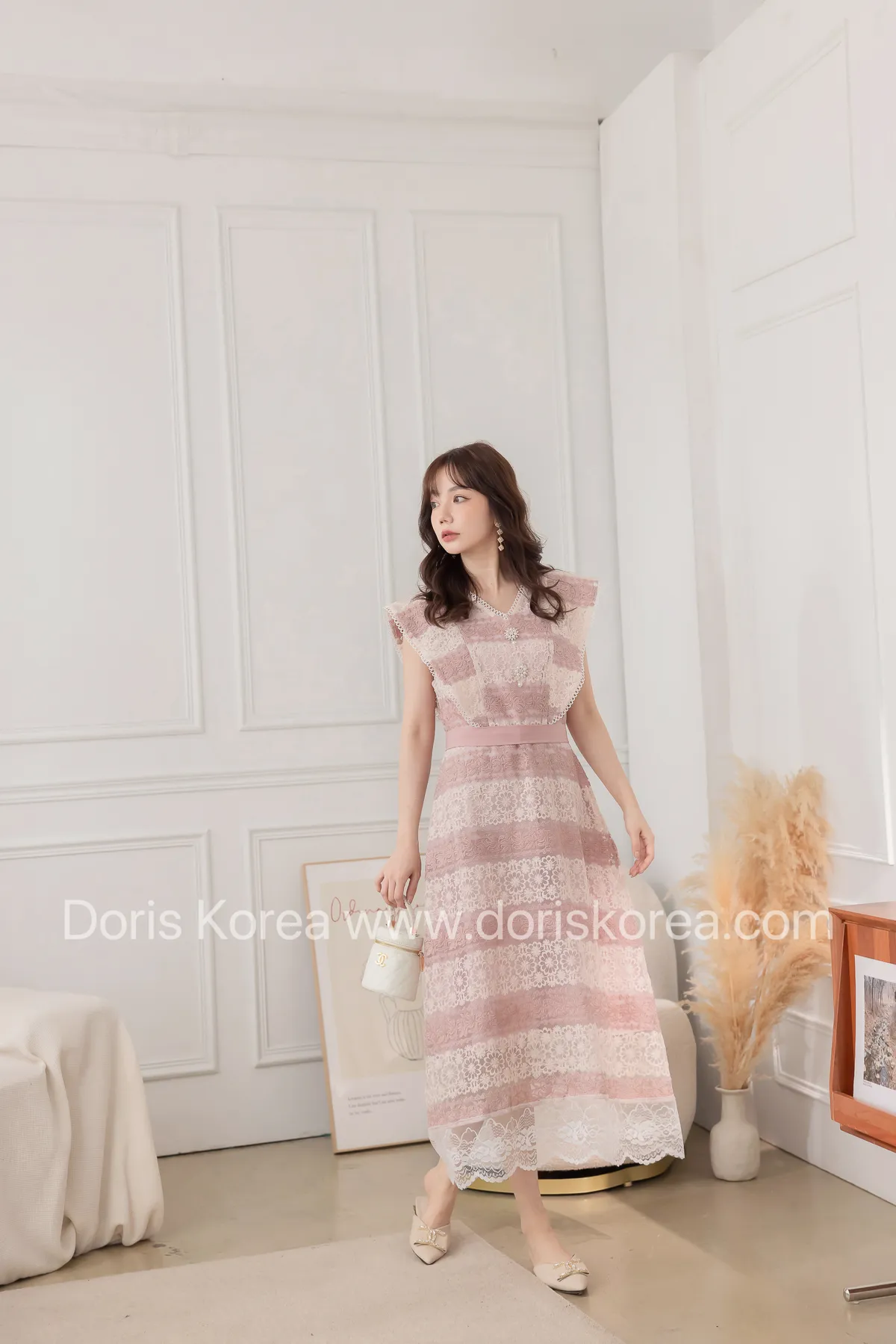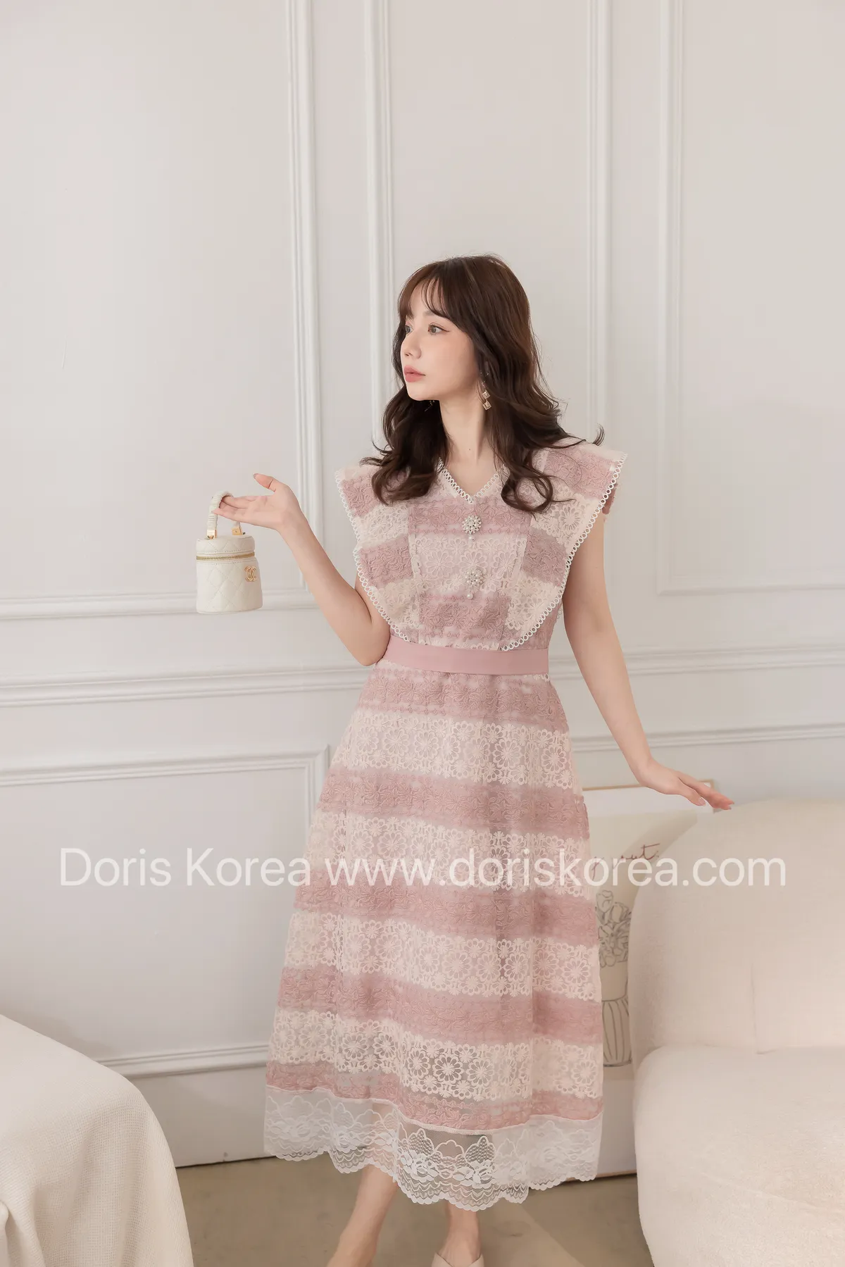 自訂款-雙色蕾絲鑽釦洋裝(粉)(附腰帶)