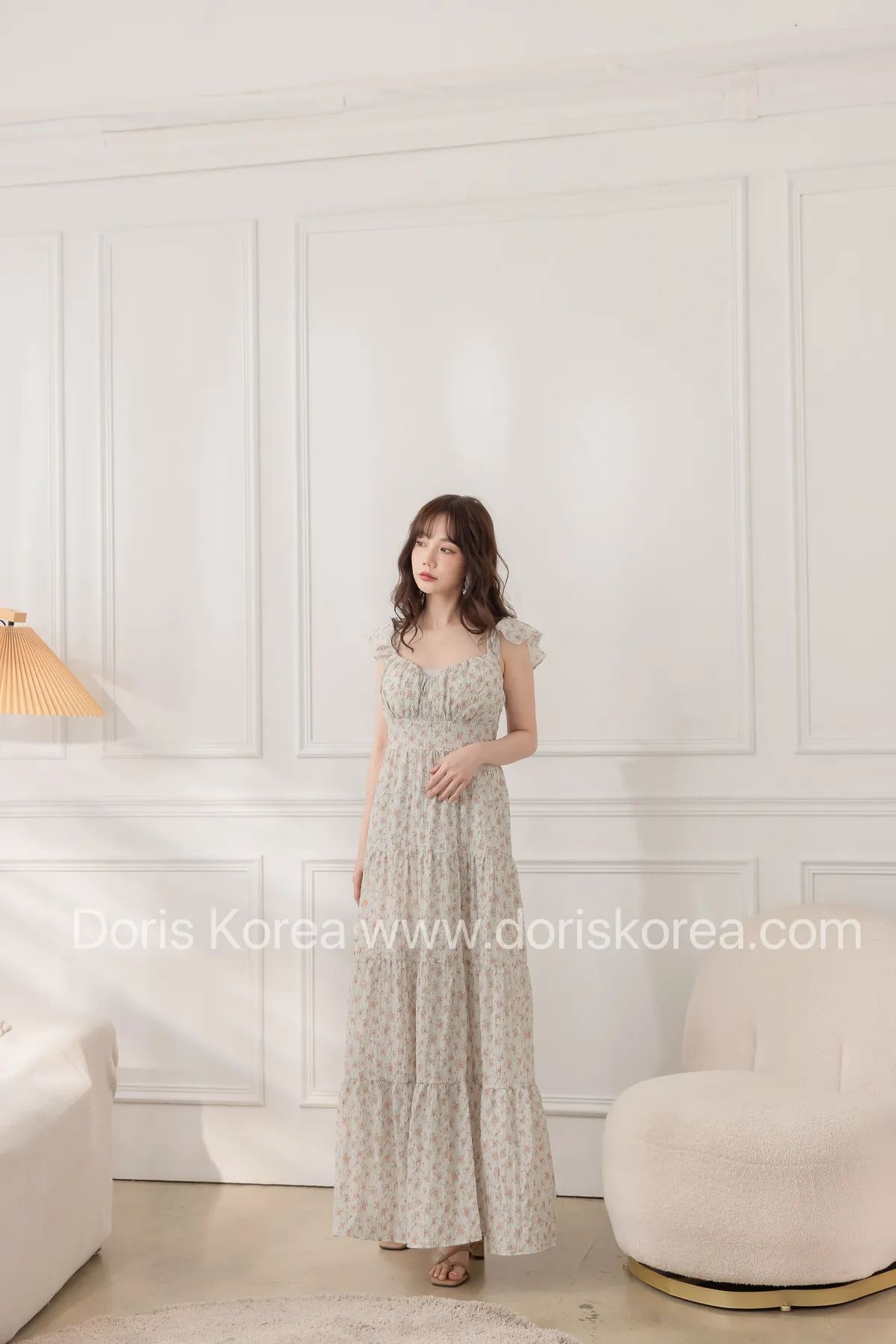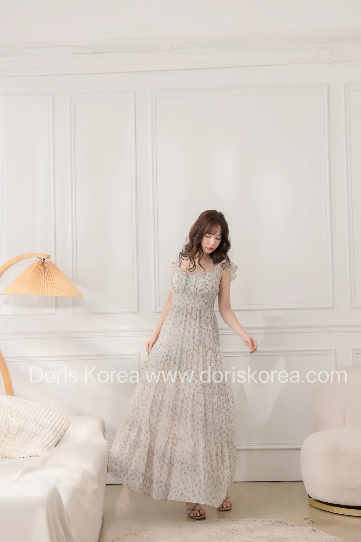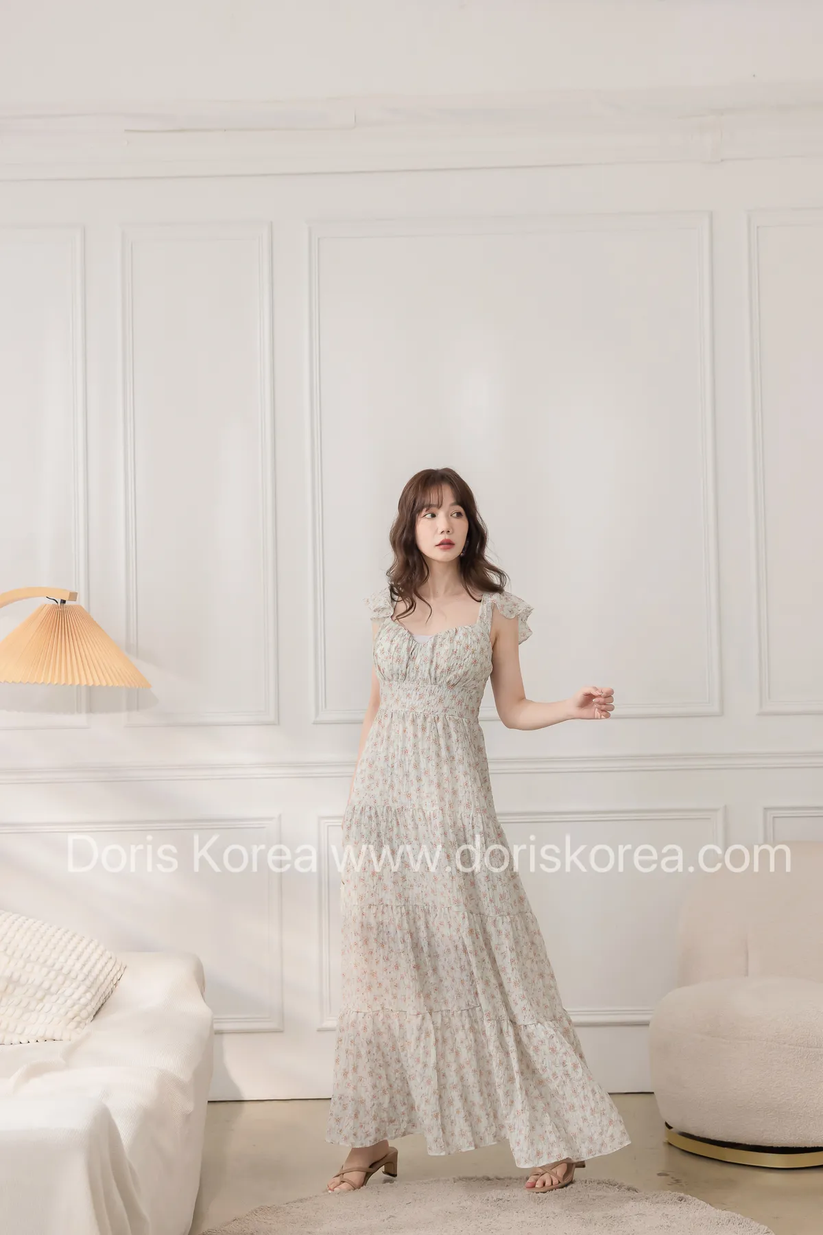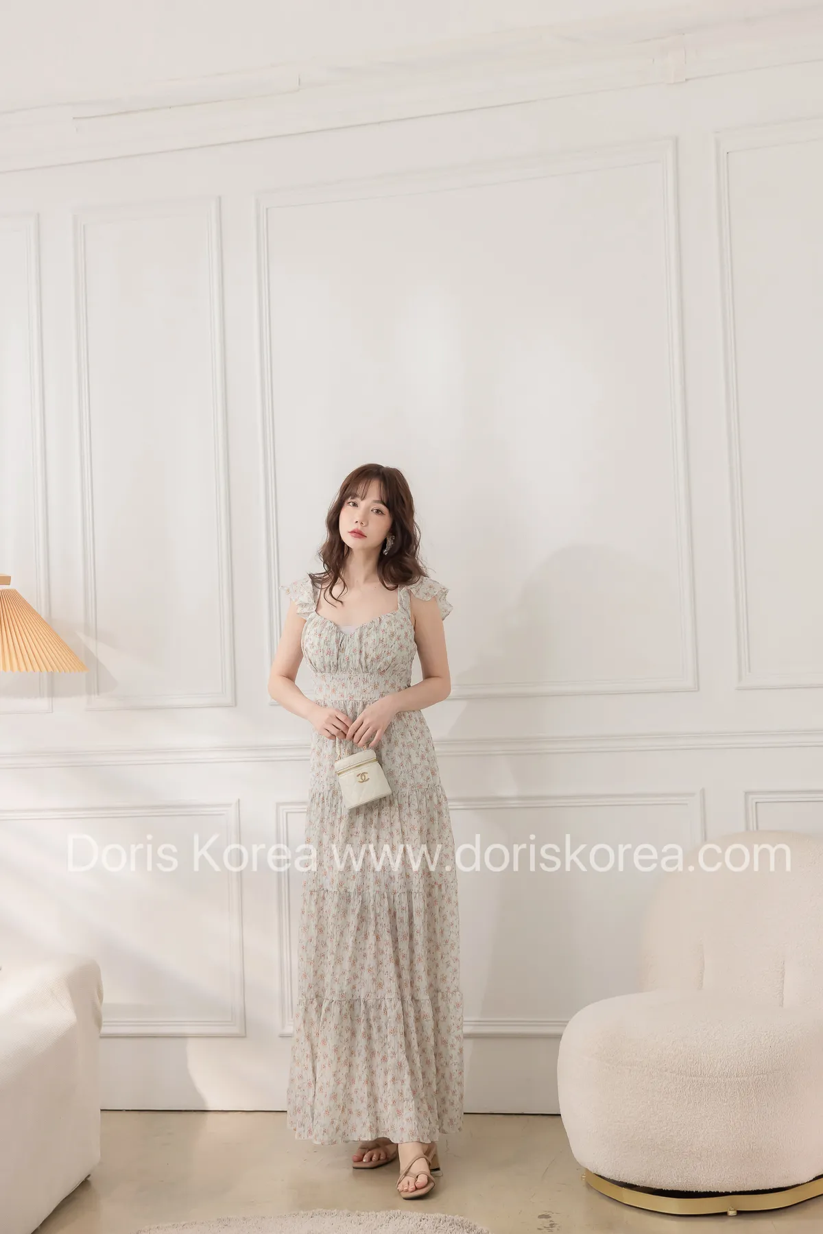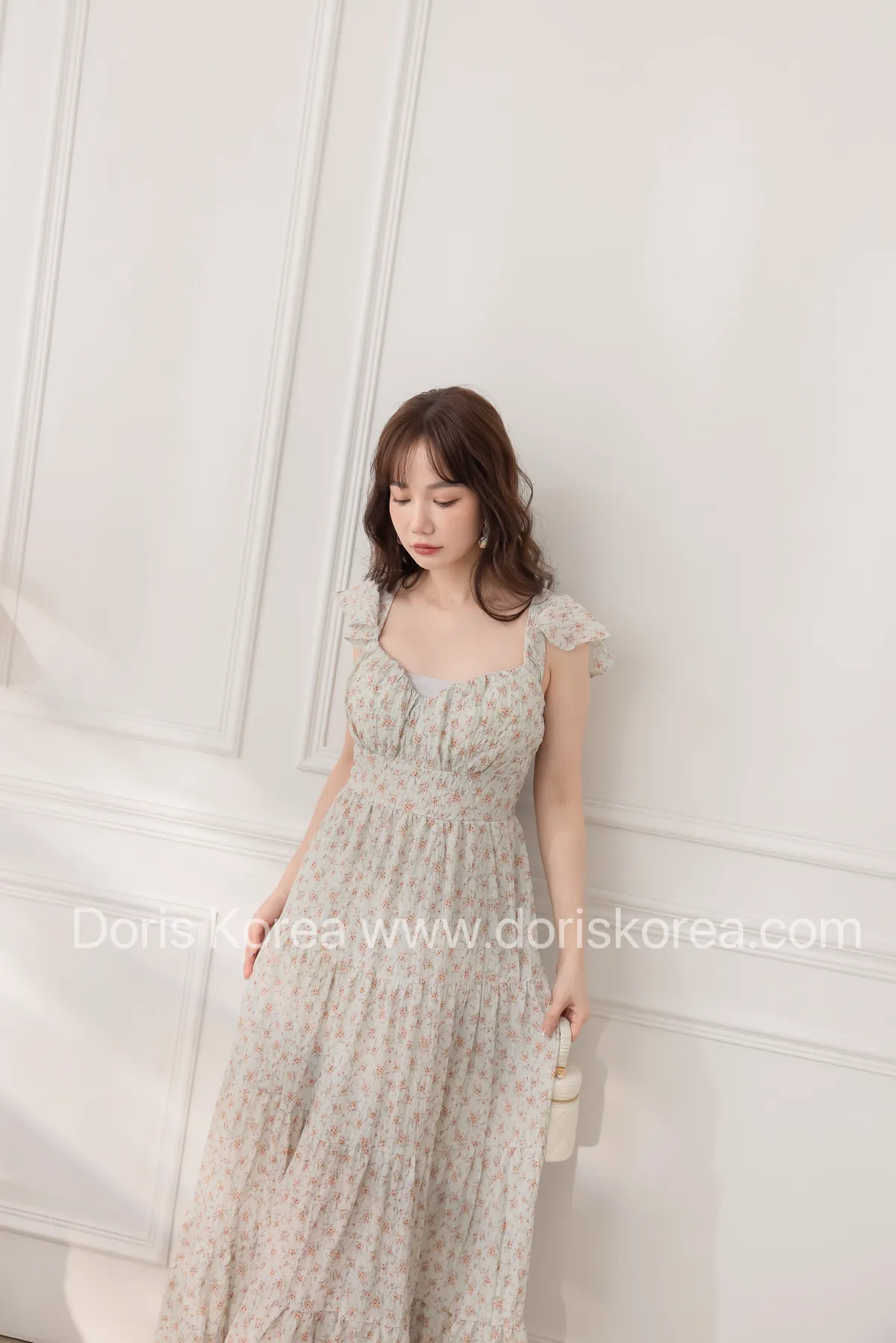 愛心領荷葉小袖子花卉洋裝(淺藍)