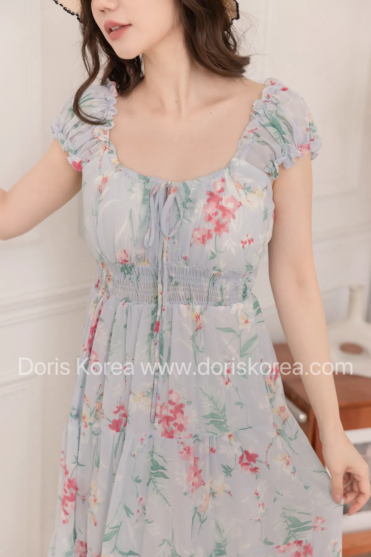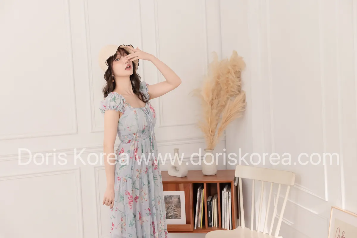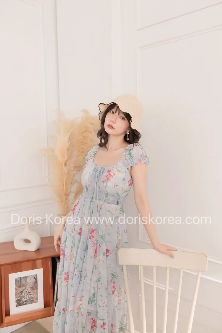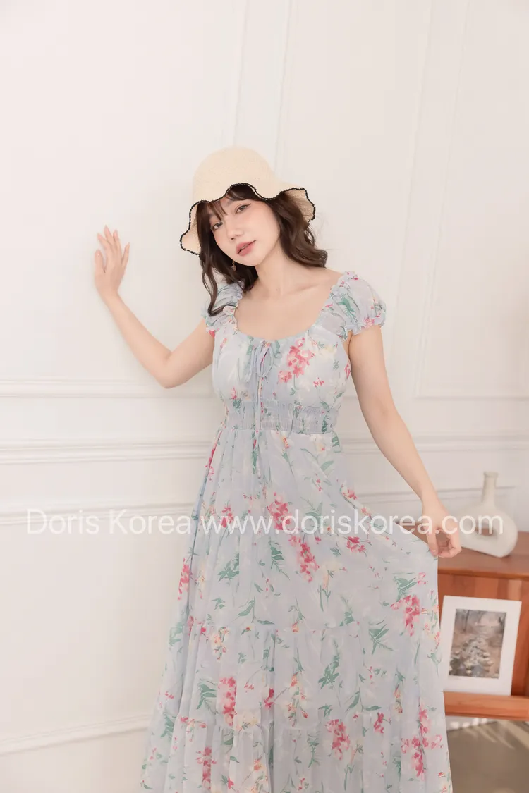 腰鬆緊暈染花捲小袖洋裝(藍)