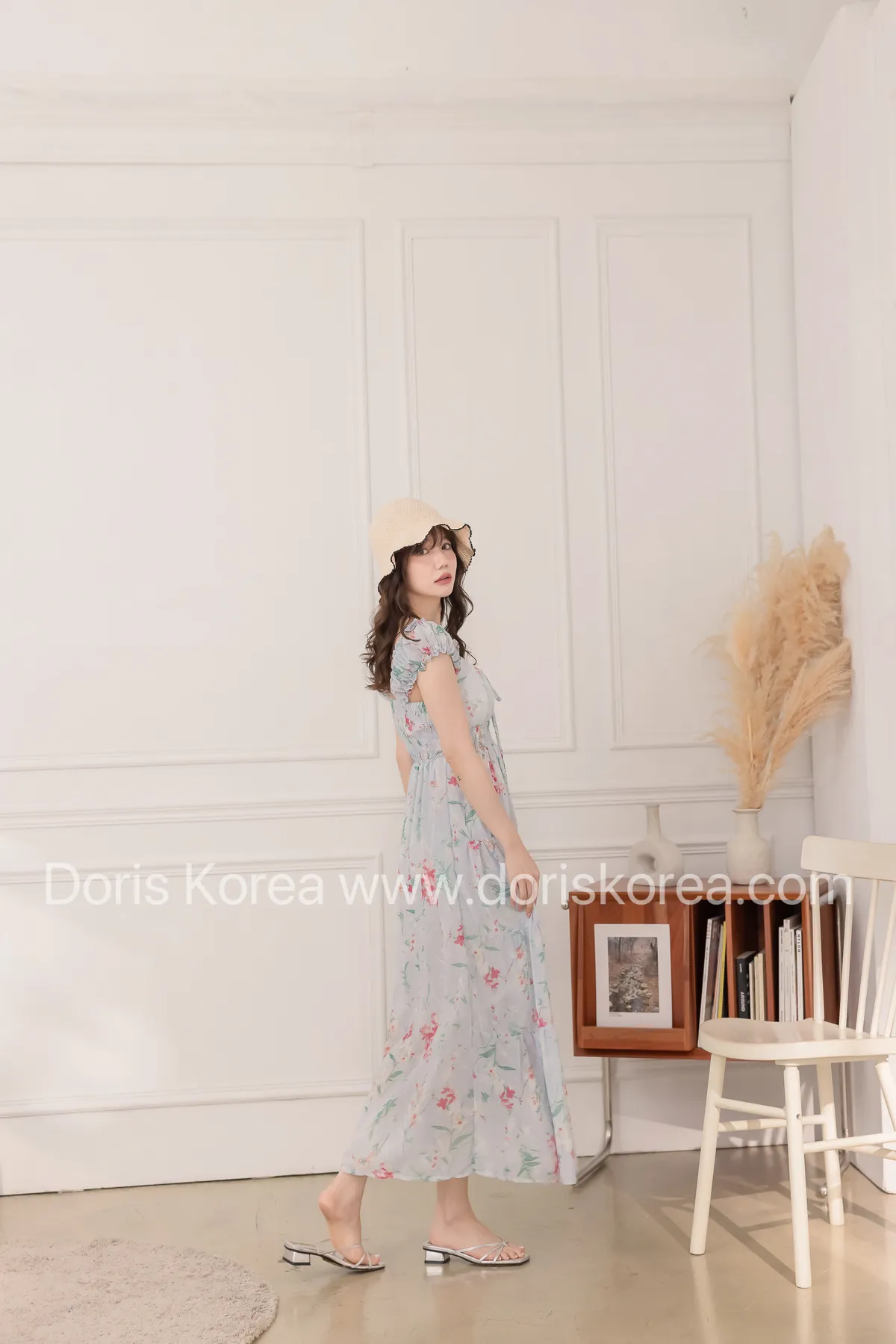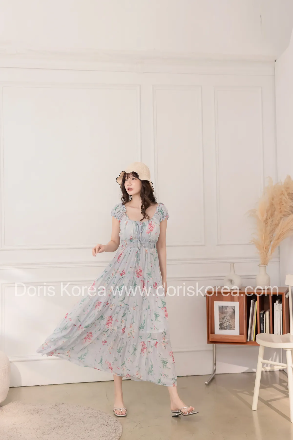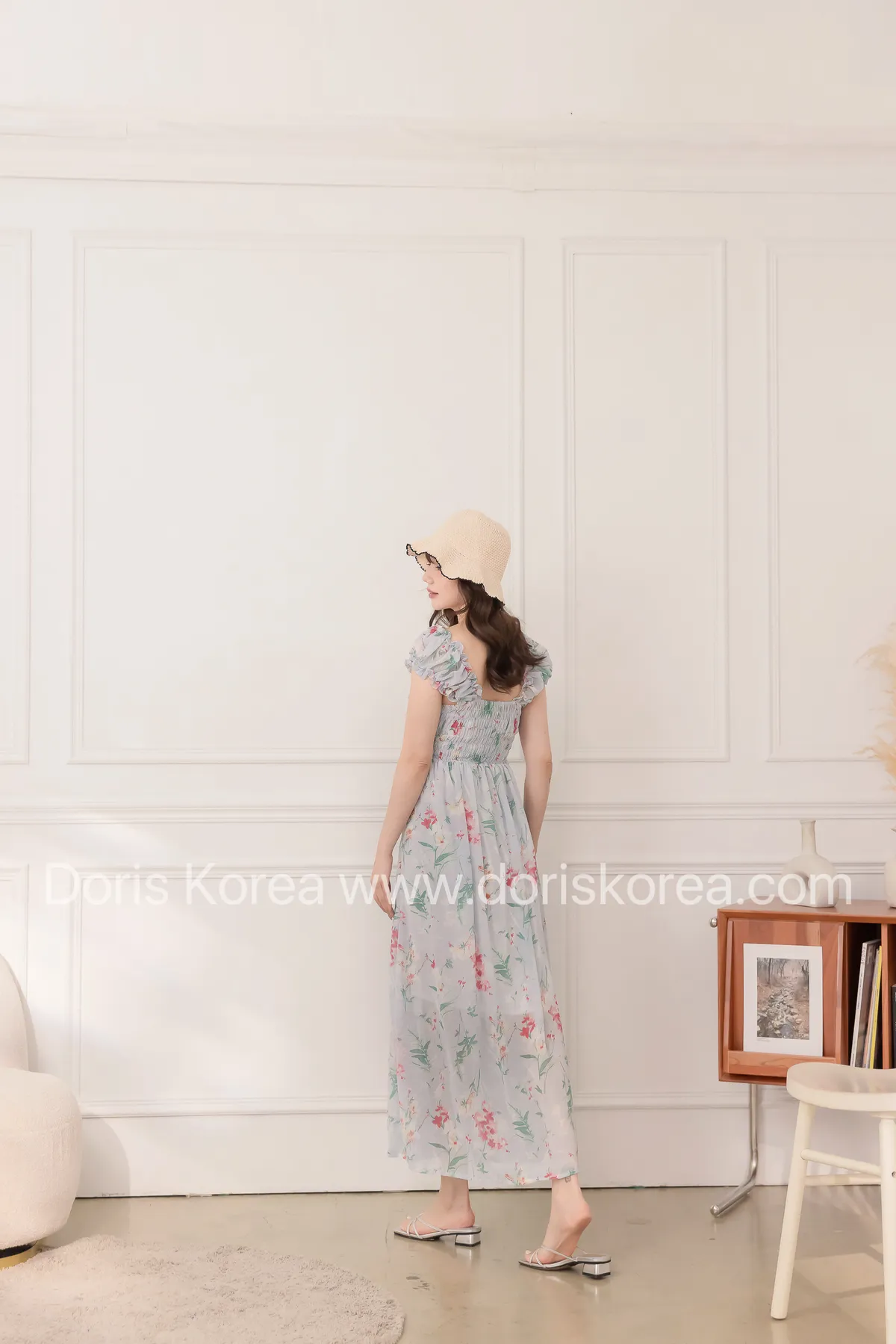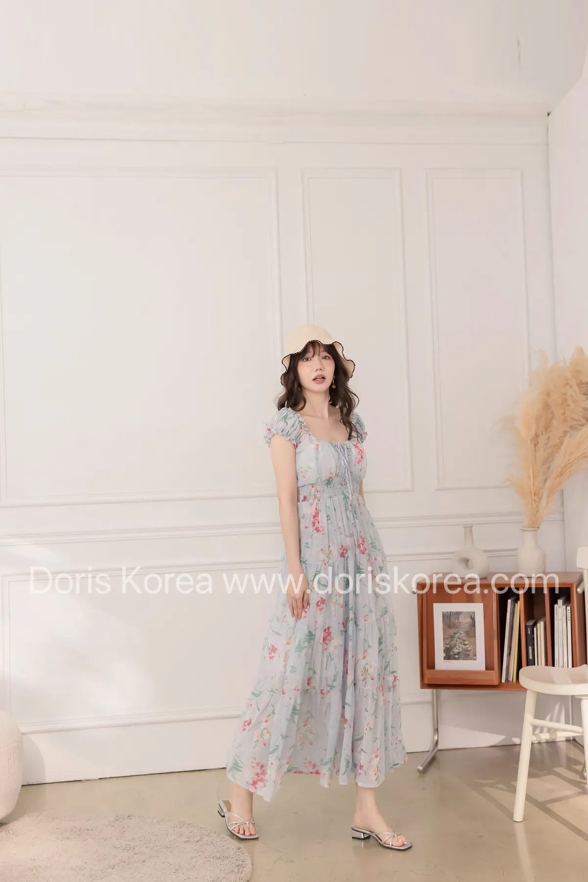 腰鬆緊暈染花捲小袖洋裝(藍)
