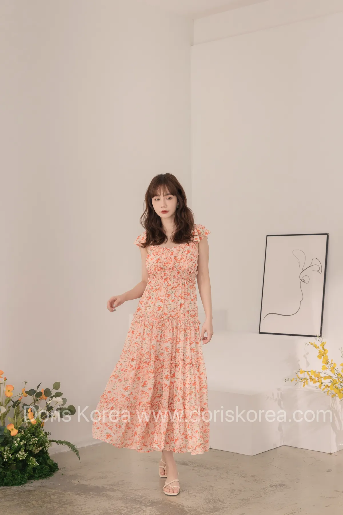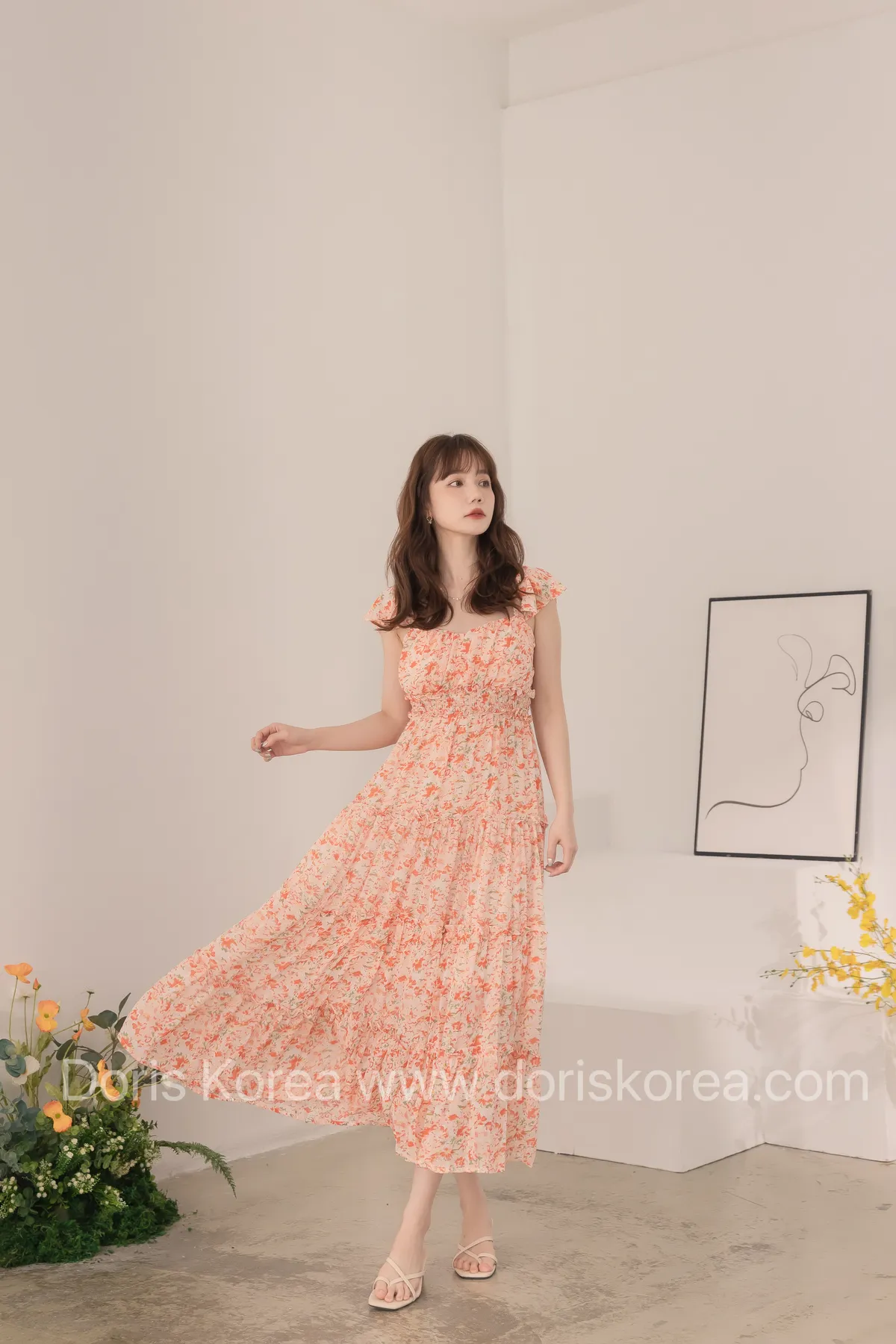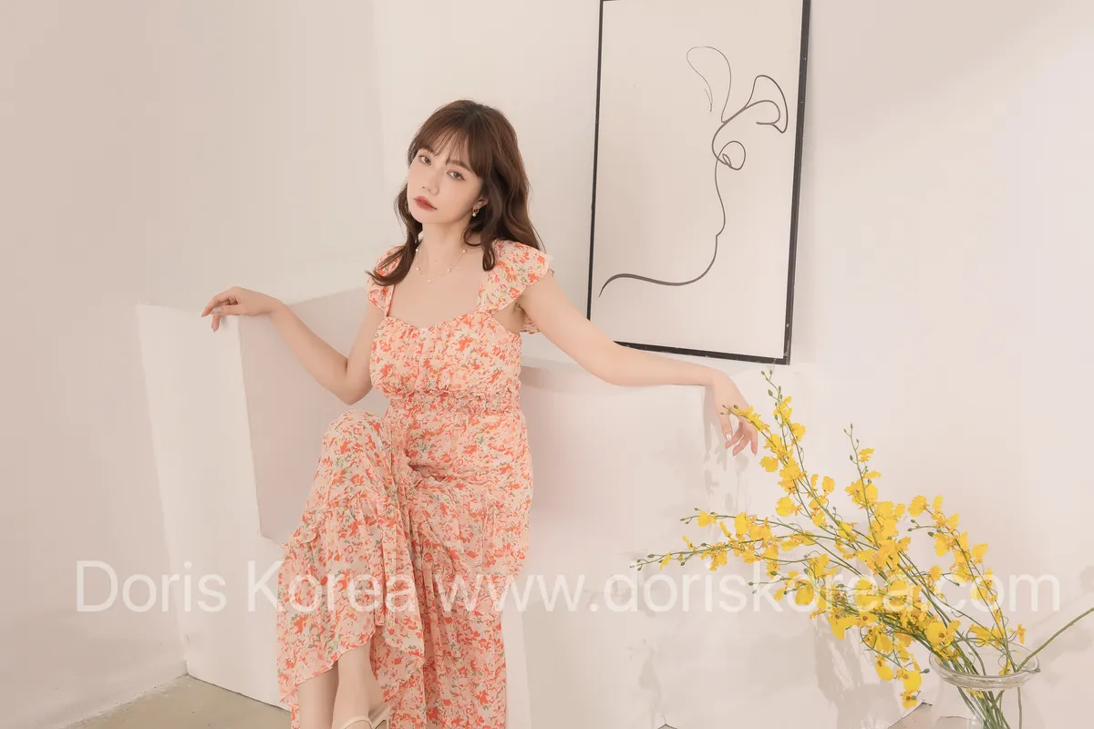 芬達小花雪紡荷葉肩帶洋裝(橘)