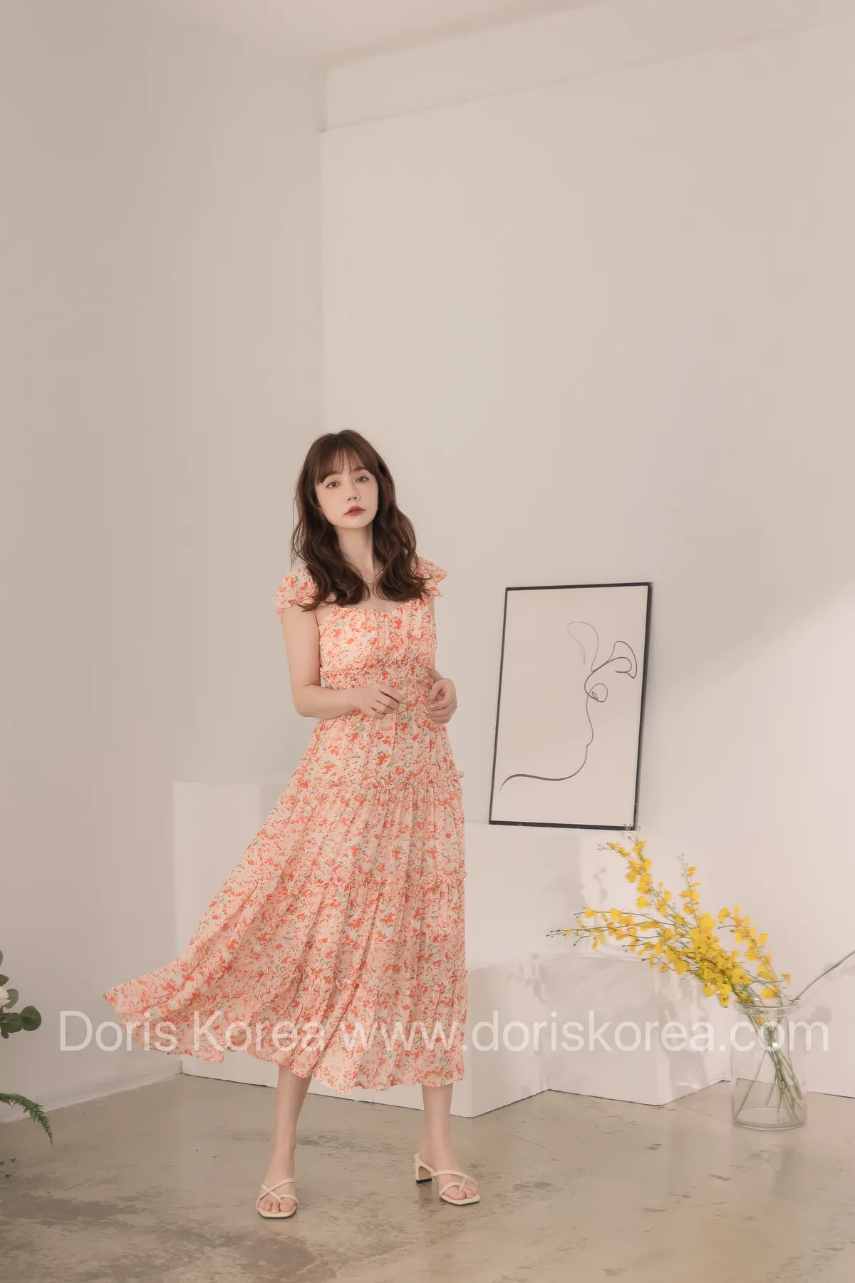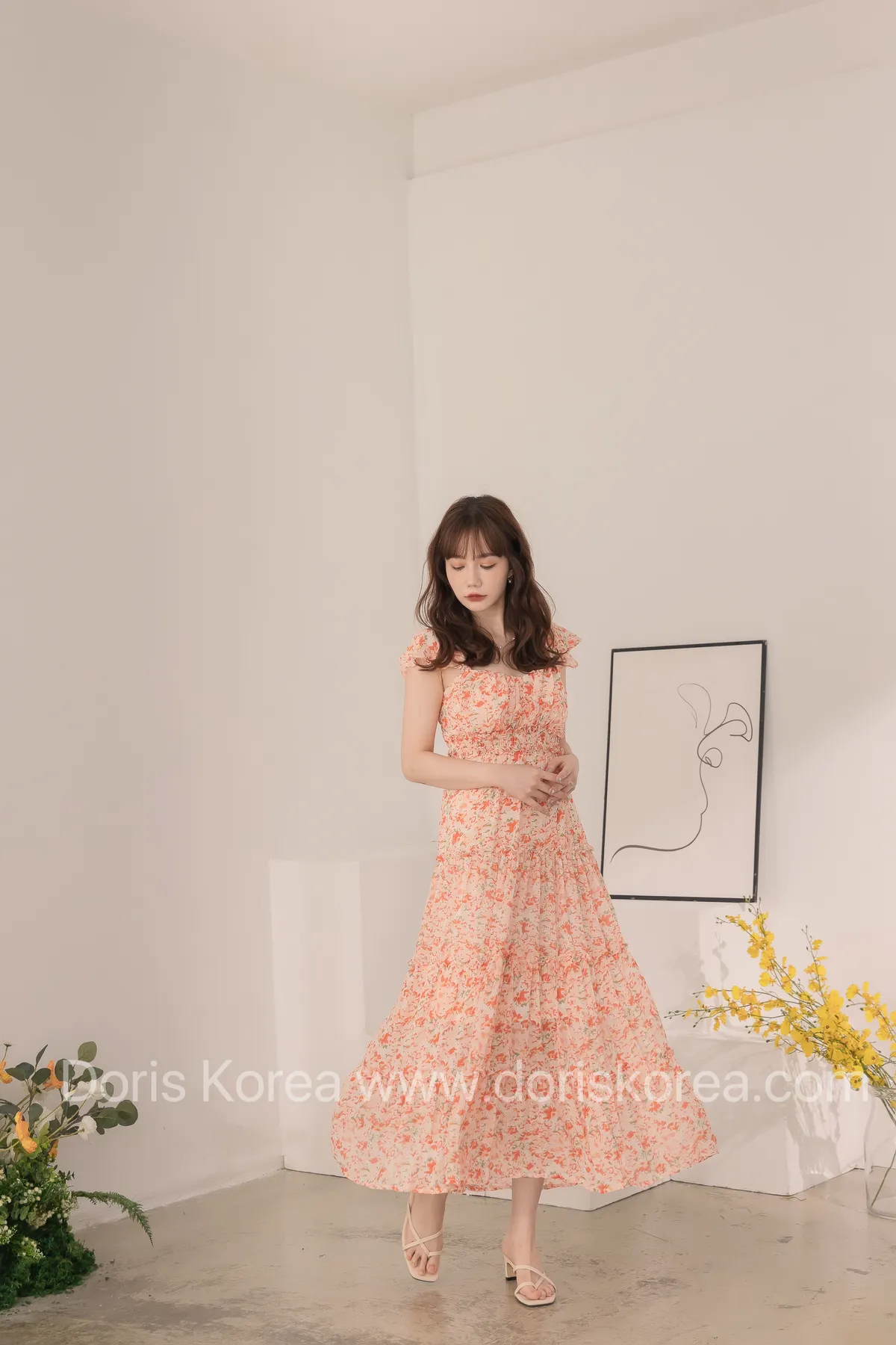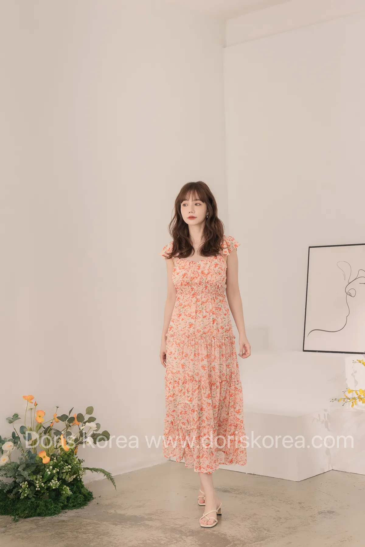 芬達小花雪紡荷葉肩帶洋裝(橘)