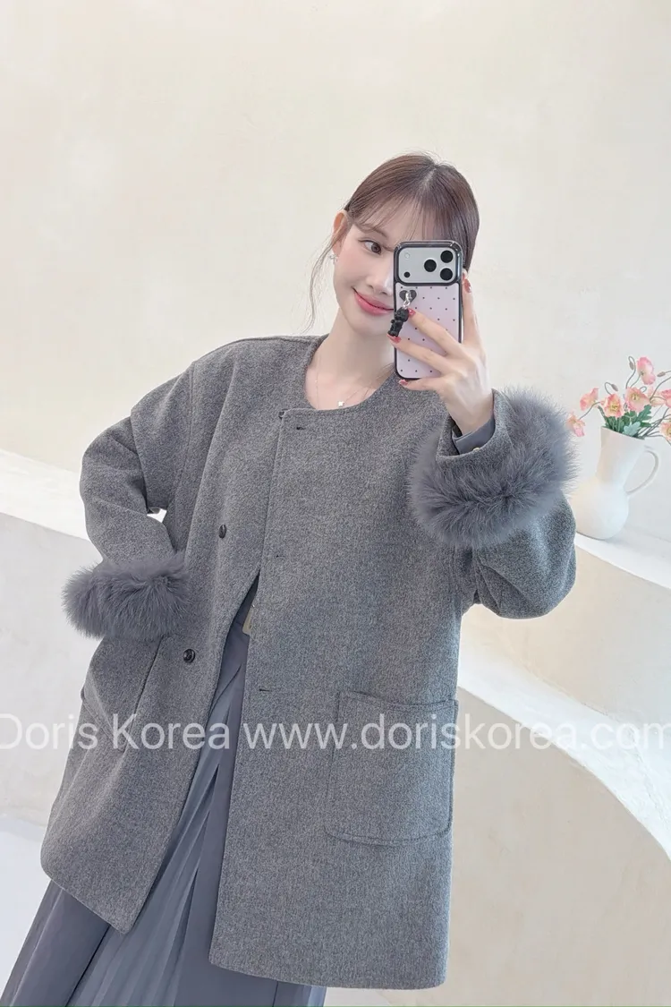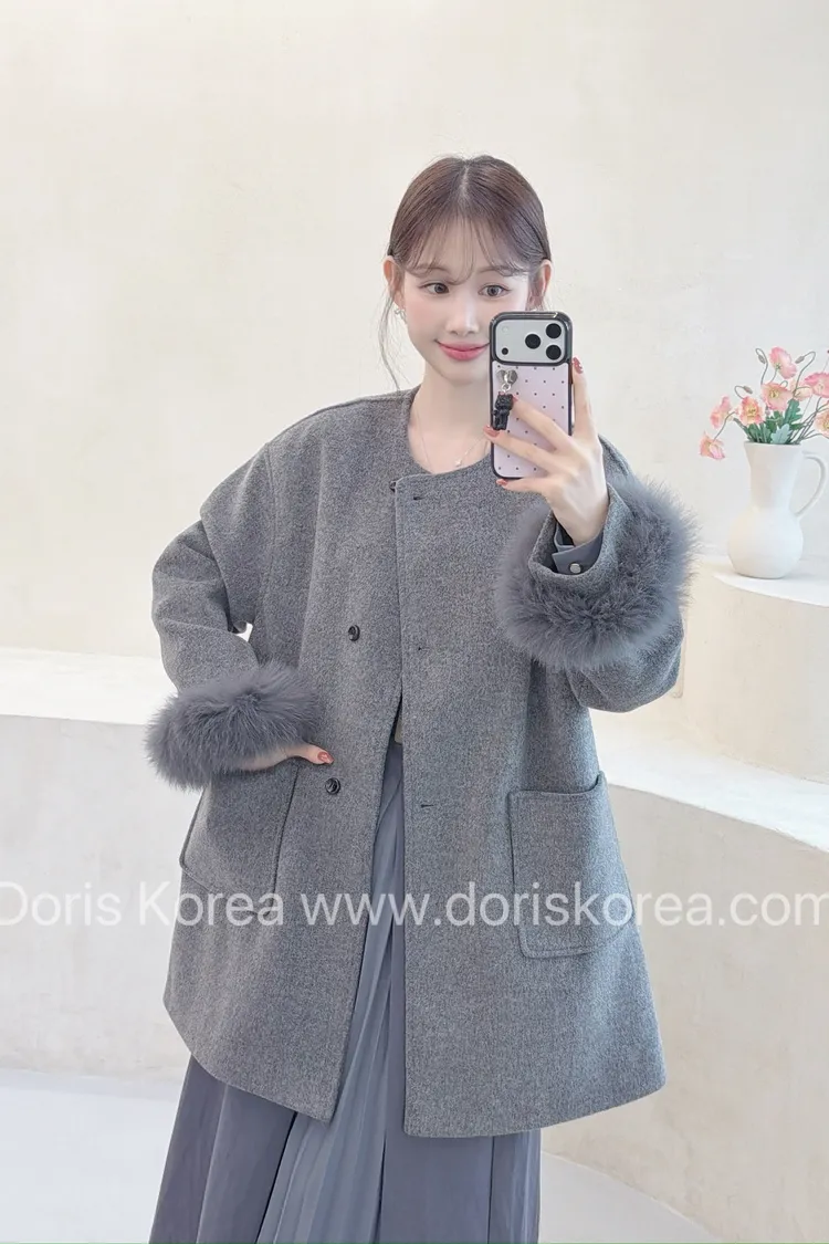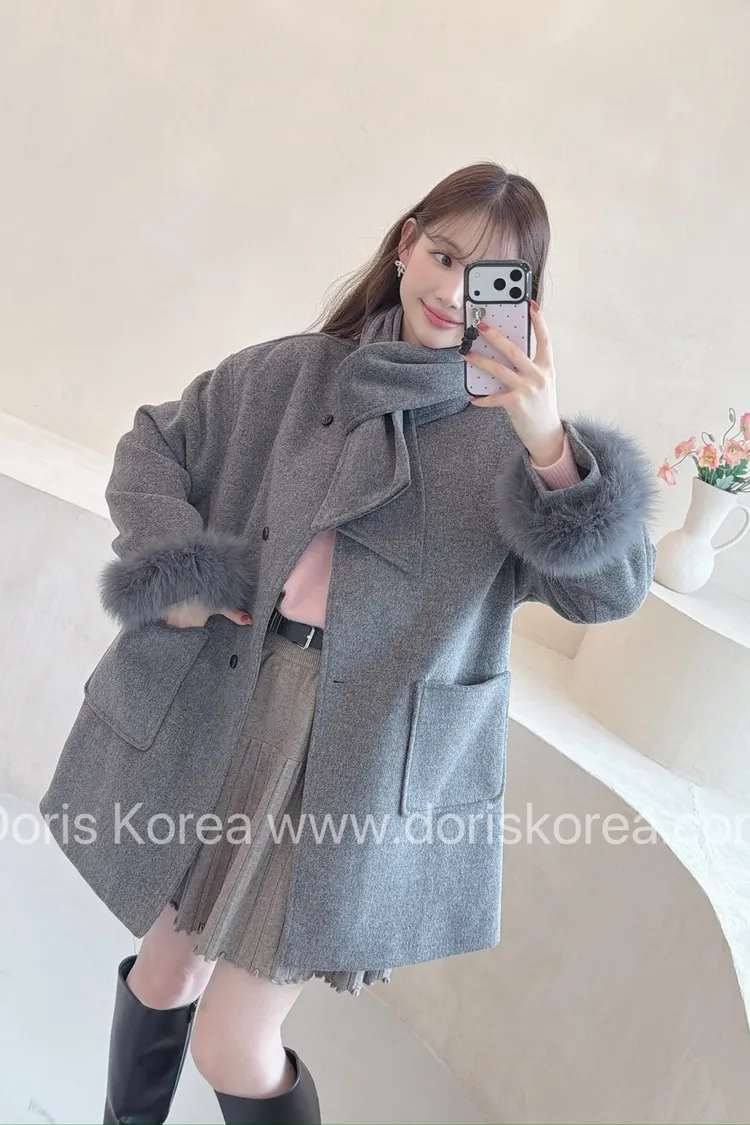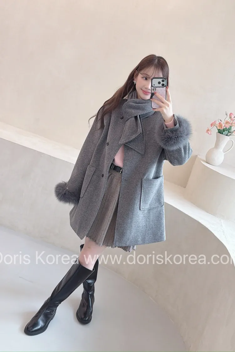 手袖狐狸毛附圍巾羊絨外套(灰)