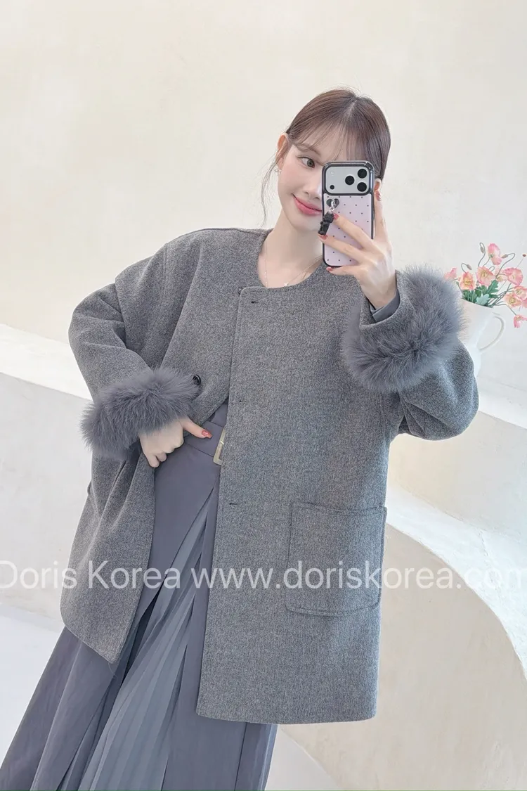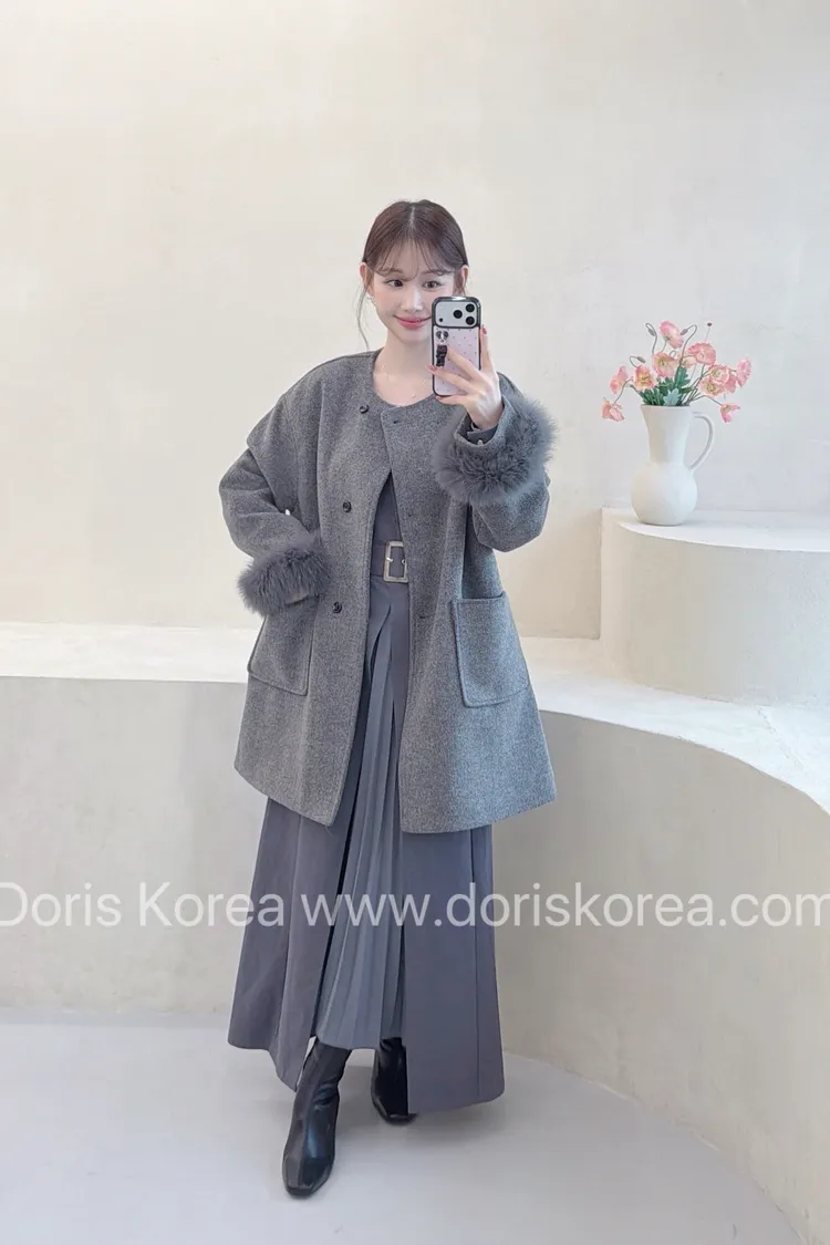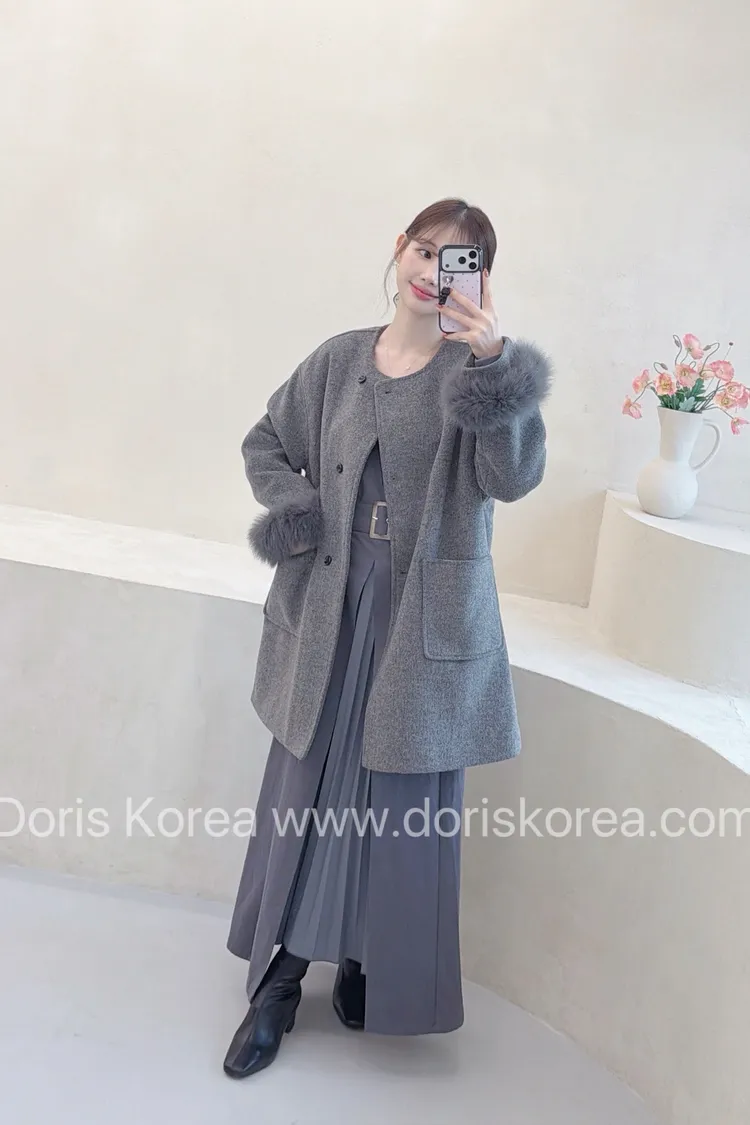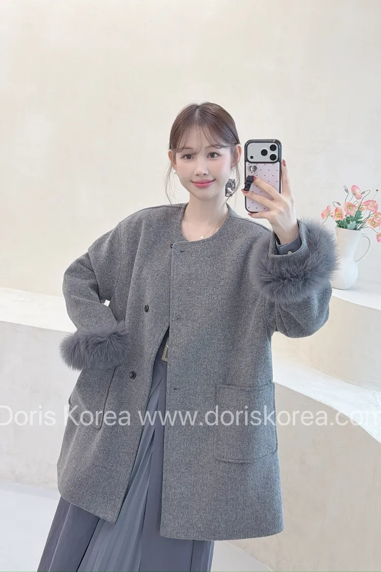 手袖狐狸毛附圍巾羊絨外套(灰)