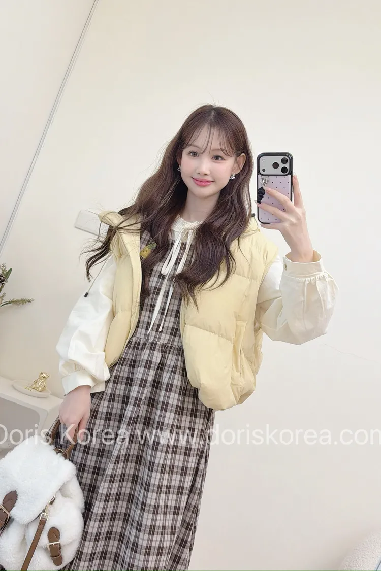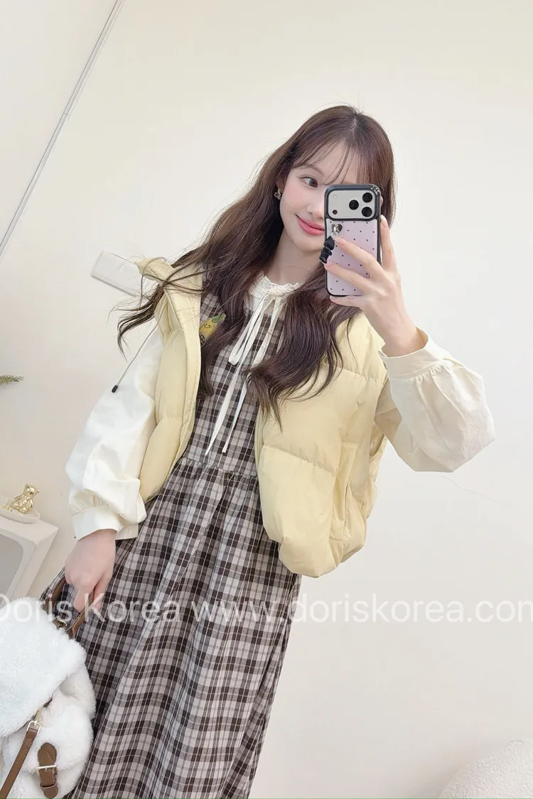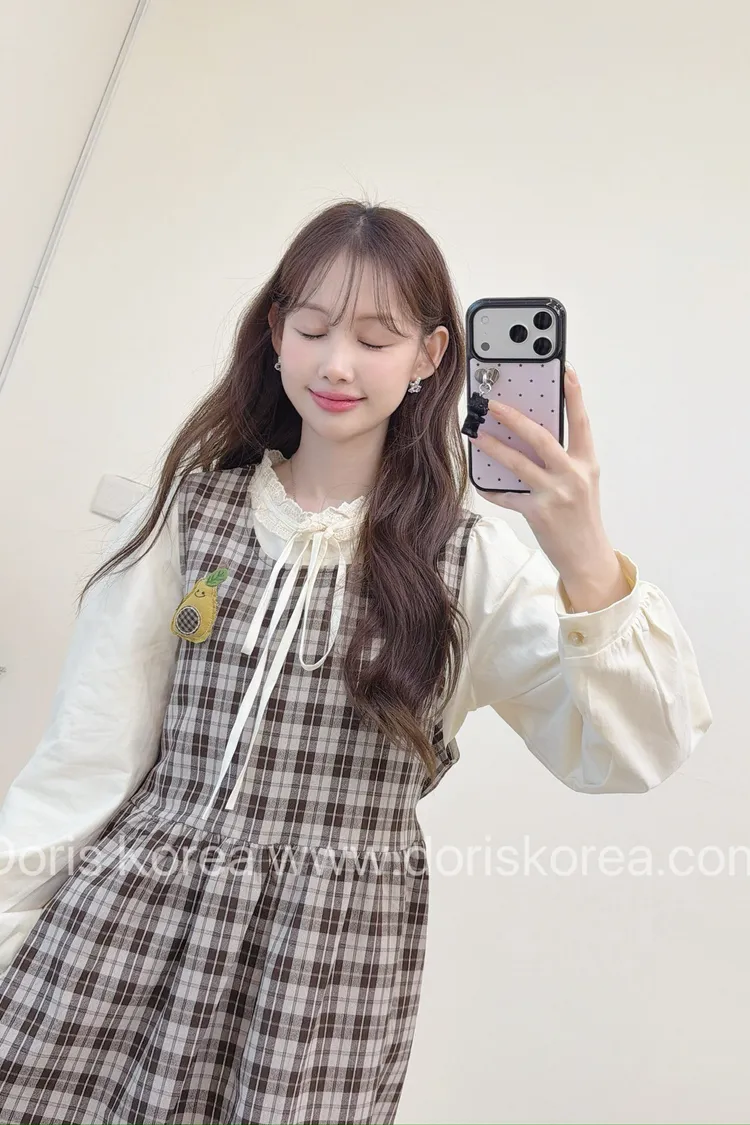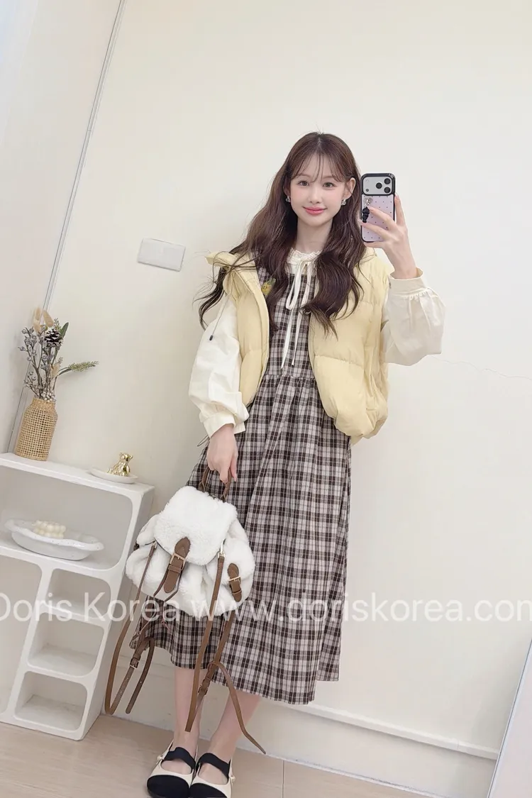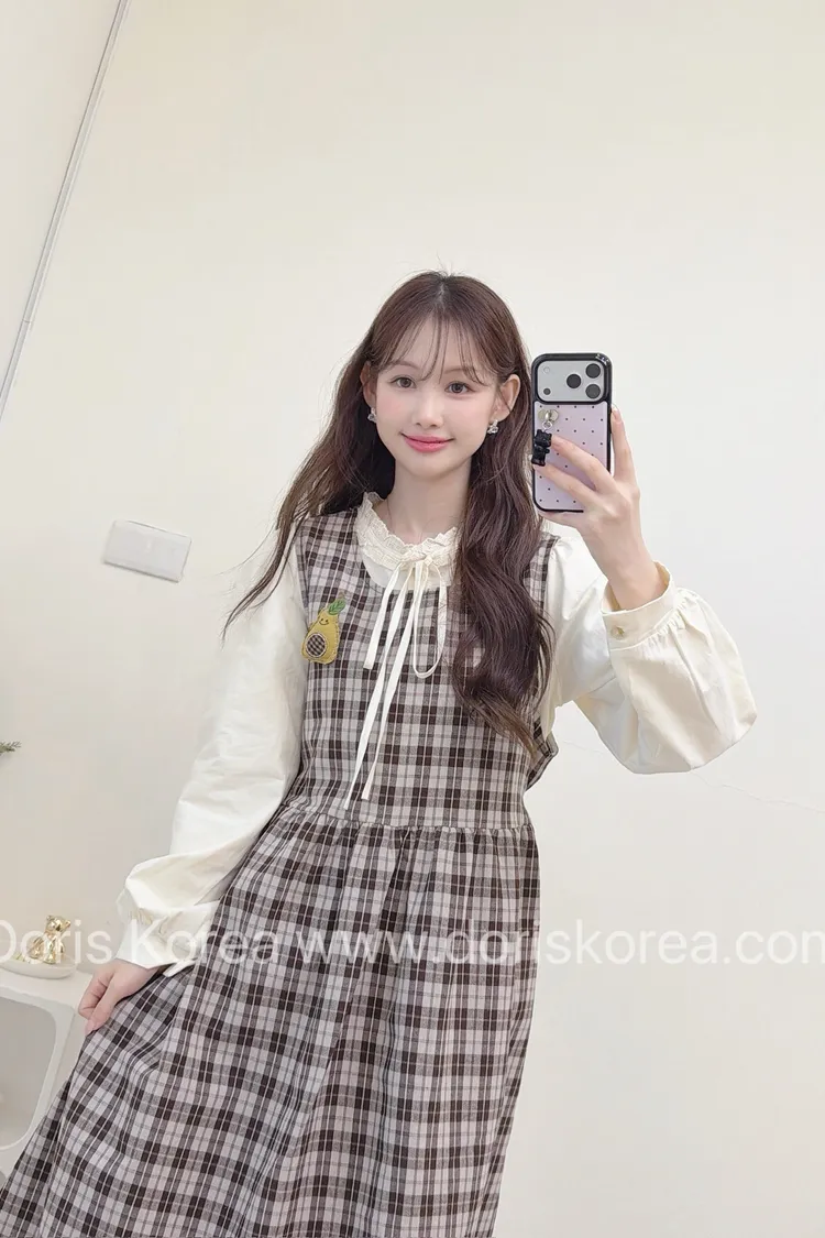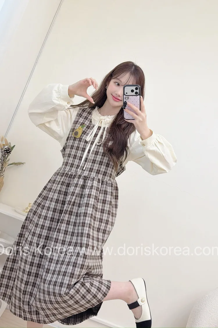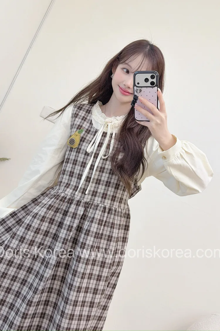 酪梨別針格紋背心洋裝+內搭(咖)